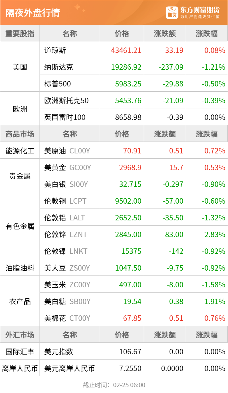 隔夜行情![]() ![]() 每日精选国债期货集体下跌!发生了什么?长债头部逐渐成形! 八周连阳之后 避险需求能否推动金价再创新高? 库存消化进度良好 苹果价格具备继续上涨基本条件 宏观产经新华社:民营经济促进法草案二审稿24日提请十四届全国人大常委会第十四次会议审议,草案二审稿增加规定,任何单位不得违反法律、法规向民营经济组织收取费用,不得实施没有法律、法规依据的罚款,不得向民营经济组织摊派财物。这样规定进一步突出了法治的保障作用。 财联社:2月24日,证监会主席吴清最新发表的《对充分发挥资本市场功能更好服务新型工业化》署名文章,对于监管工作方向有了新的细化补充,这次是以资本市场服务实体经济高质量发展的视角切入的,落脚点在于新质生产力的发展。 人民日报:生态环境部、国家发展改革委等16部门近日联合印发《关于加强生态环境领域科技创新推动美丽中国建设的实施意见》,旨在凝聚生态环境领域相关部门合力,联合推动生态环境领域科技发展,并为地方与相关科研院所、高校和企业推进生态环境领域科技创新提供重要依据和指引。 品种资讯黑色系期货 铁矿石:2025年02月17日-02月23日中国47港铁矿石到港总量2275.1万吨,环比减少58.7万吨;中国45港铁矿石到港总量2102.7万吨,环比减少128.1万吨;北方六港到港总量1221.8万吨,环比增加133.3万吨。(Mysteel) 2025年02月17日-02月23日Mysteel澳洲巴西铁矿发运总量2575.4万吨,环比增加1333.6万吨。澳洲发运量1856.1万吨,环比增加1067.9万吨,其中澳洲发往中国的量1582.1万吨,环比增加913.1万吨。巴西发运量719.3万吨,环比增加265.6万吨。(Mysteel) 锰硅:锰矿发运数据(2.14-2.20):全球发运:(南非47.13澳3.79加蓬10.75共计61.67万吨)到港中国:(南非18.83澳0加蓬3.03共计21.86万吨)海漂:(南非44.41澳6.04加蓬0共计50.45万吨)。(Mysteel) 农产品期货 棕榈油:马来西亚棕榈油局(MPOB)表示,预计马来西亚棕榈油库存将在2月底降至150万吨,为近两年来的最低水平。(新华财经) 菜粕:截至2月21日,沿海地区主要油厂菜籽库存41.1万吨,环比上周减少1.3万吨;菜粕库存3.4万吨,环比上周减少0.15万吨;未执行合同为14.5万吨,环比上周减少1.55万吨。(Mysteel) 豆粕:近期,多家饲料生产企业陆续发布涨价通知,产品价格涨幅在50元/吨至200元/吨之间,涉及猪浓缩料、乳猪料、鸡料、牛料等多类产品。(央视财经) 油脂:截至2025年02月21日,全国重点地区豆油、棕榈油、菜油三大油脂商业库存总量为201.32万吨,较上周增加5.18万吨,涨幅2.64%;同比去年同期上涨7.75万吨,涨幅4.00%。(Mysteel) 有色/贵金属期货 多晶硅:本周国内龙头企业再度拉涨有机硅全产品价格,DMC报价较上周上调500元/吨,107胶、硅油、生胶同期跟涨500元/吨,其他单体企业DMC报价纷纷上调至14000元/吨,市场整体报价重心快速上升,下游采购情绪适当刺激。(SMM) 沪铜:截至本周一(2月24日)国内市场电解铜现货库存37.23万吨,较2月17日增1.89万吨,较2月20日增1.42万吨; 其中上海库存23.15万吨,较17日增1.99万吨;广东库存7.30万吨,较17日降0.7万吨。(Mysteel) 沪锌:截至本周一(2月24日),SMM七地锌锭库存总量为14.56万吨,较2月17日增加1万吨,较2月20日增加0.85万吨,国内库存录增。(SMM) 能化期货 尿素:中国农业生产资料流通协会24日发布稳定钾肥市场的倡议。倡议称,化肥生产、流通企业及相关渠道商不囤货、不哄抬价格、不释放涨价预期,不参与钾肥倒买倒卖等投机行为;行业企业应坚持稳健经营,有效防范风险,根据经营情况,合理采购,不跟风、不炒作、不进行恐慌性购买。(新华财经) 橡胶:截至2025年2月23日,青岛地区天胶保税和一般贸易合计库存量57.56万吨,环比上期增加0.7万吨,增幅1.23%。保税区库存6.74万吨,增幅0.44%;一般贸易库存50.82万吨,增幅1.34%。(隆众资讯) 原油:伊拉克石油部长表示,库尔德地区的石油出口将在一周内恢复。(财联社) 沥青:最新数据显示,截至2月24日当周,国内沥青社会库存总量为144.6万吨,环比上升3.7%。本周华东地区社会库存增长较为显著。(隆众资讯) 其他期货 欧线集运:截至2025年2月24日,上海出口集装箱结算运价指数(欧洲航线)报1684.40点,与上期相比跌11.2%。(上海航运交易所) 环球视野新华财经:据外媒报道,因国际市场上钴供应过剩导致价格疲弱,刚果决定暂停钴出口四个月。 央视新闻:乌克兰总统泽连斯基在基辅召开的 “支持乌克兰”国际会议全会会议结束后的新闻发布会上发表声明。泽连斯基表示,希望在2025年结束俄乌冲突,而不是3年后。 每日关注无 (文章来源:东方财富研究中心) |