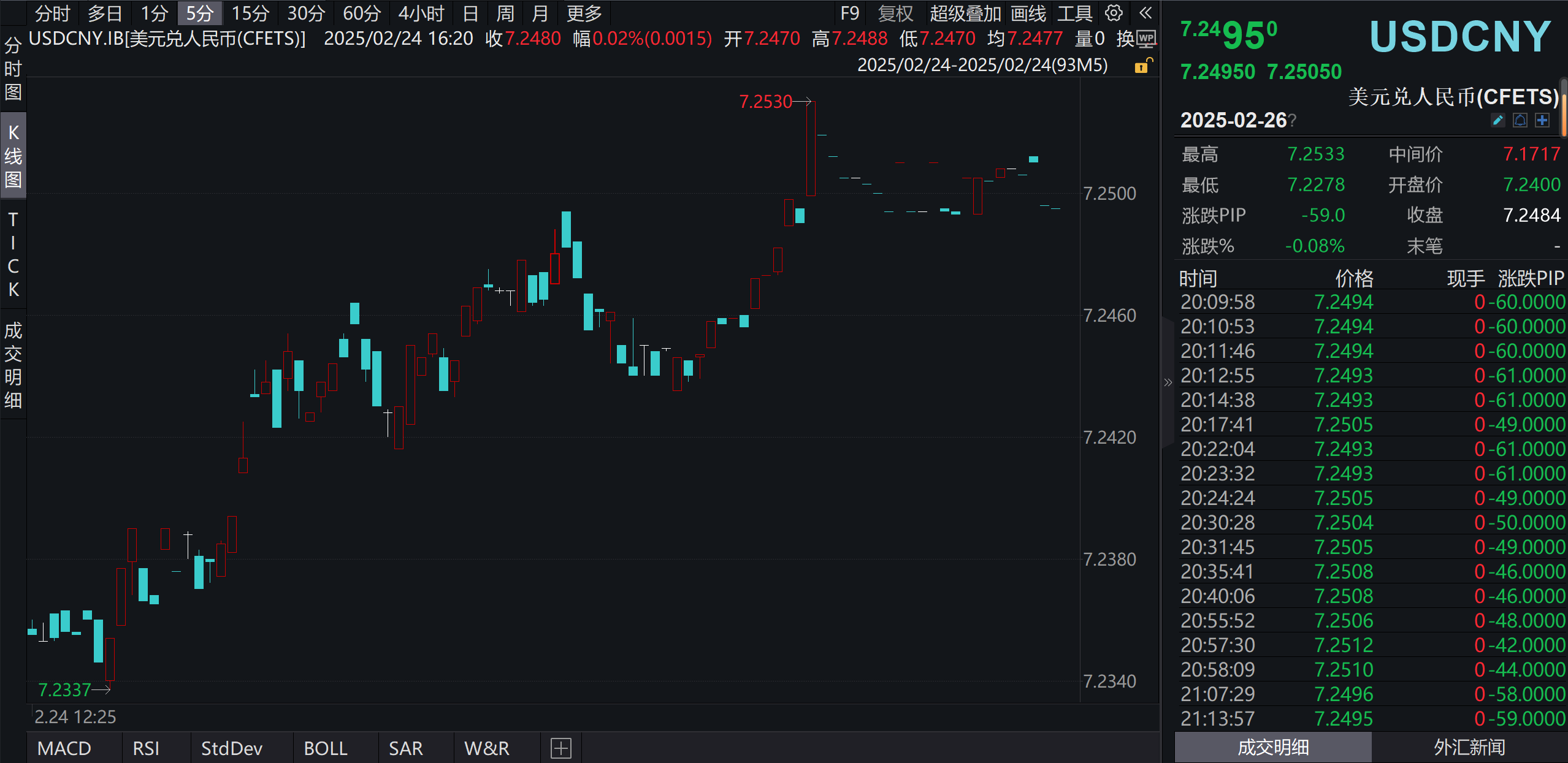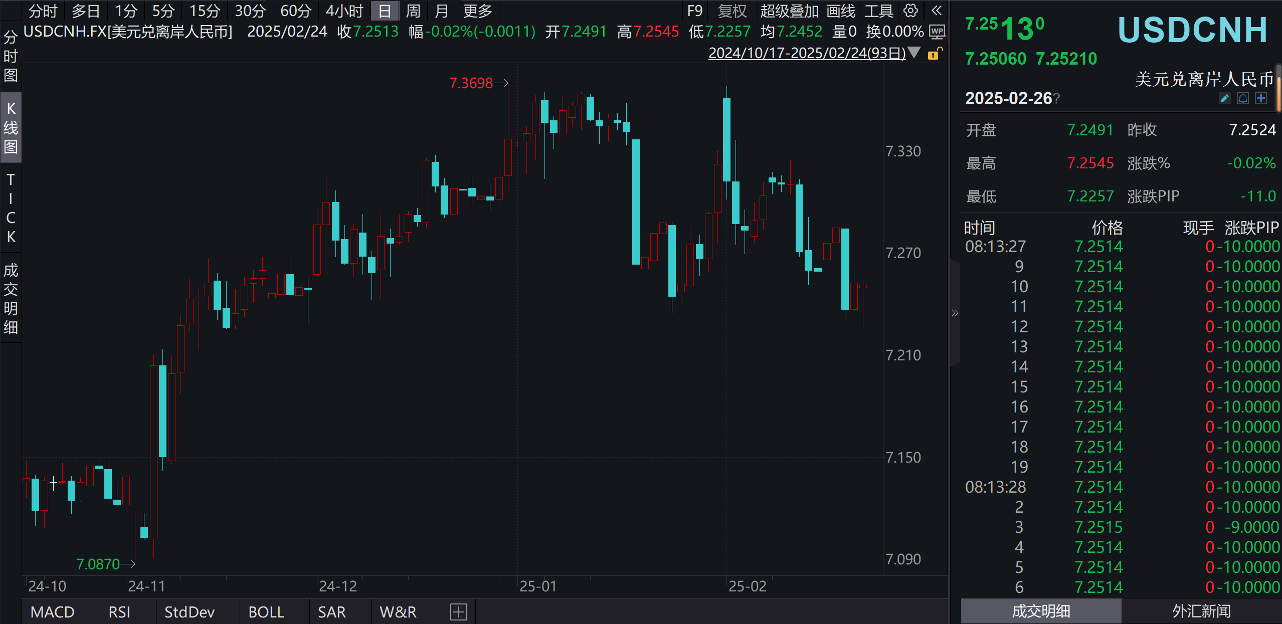 境内外人民币汇率正在快速收复7.25一线。 截至2月24日19时,境内在岸市场美元兑人民币汇率(CNY)与境外离岸市场美元兑人民币汇率(CNH)分别徘徊在7.2502与7.2498附近,盘中分别触及日内新高7.2278与7.2252。 这意味着境内外人民币汇率已从两周前的7.3一线明显企稳反弹。 业内人士向记者透露,过去两周人民币汇率呈现回升态势,主要受三大因素影响,一是特朗普政府持续加码贸易保护主义政策令全球金融市场对美国经济增长风险的担忧加剧,导致美元指数从108.4跌至106.6附近;二是DeepSeek面世令中国科技股日益受到全球资本追捧,带动离岸市场人民币需求上升;三是在节后中国国债收益率持续回升的影响下,中美利差倒挂幅度明显收窄,令海外量化投资基金相应增加离岸人民币多头头寸。 “需要注意的是,近日离岸人民币汇率与在岸人民币汇率的汇差明显收窄至不到20个基点,显示海外投资机构押注人民币汇率下跌的力度大幅削减。”他向记者分析说。尽管美联储释放放缓降息信号,但这不足以改变海外投资机构继续看涨人民币汇率的氛围。毕竟,当前全球金融市场关注焦点是DeepSeek等一系列中国高科技产品取得突破,正给中国经济增长注入新的动能。 记者多方了解到,近日境内外人民币汇率持续回升,还得益于近日中国财政部发行的离岸中国国债得到市场追捧,显示全球资本对人民币资产的配置热情高涨。 2月19日,中国财政部在香港面向机构投资者成功招标发行125亿元人民币国债,认购倍数达到2.86倍。 “在离岸中国国债发行获得资本热捧后,部分海外对冲基金的离岸人民币空头头寸迅速减少。”上述业内人士指出。 在他看来,这些海外对冲基金迅速减仓离岸人民币空头头寸,也与上周全球资本削减美元多头头寸有着密切关系。美国商品期货交易委员会(CFTC)发布的数据显示,截至2月11日当周,外汇市场投机客的美元净多头头寸较前一周减少47亿美元,降至265亿美元,创下去年10月以来的最大单周跌幅。 东方金诚分析师王青认为,短期而言,美元走势仍将是影响人民币汇率的主要因素。但鉴于未来美国政府出台关税政策存在较大不确定性,未来一段时间美元将面临大幅波动,这意味着人民币汇率也将呈现宽幅波动状况。