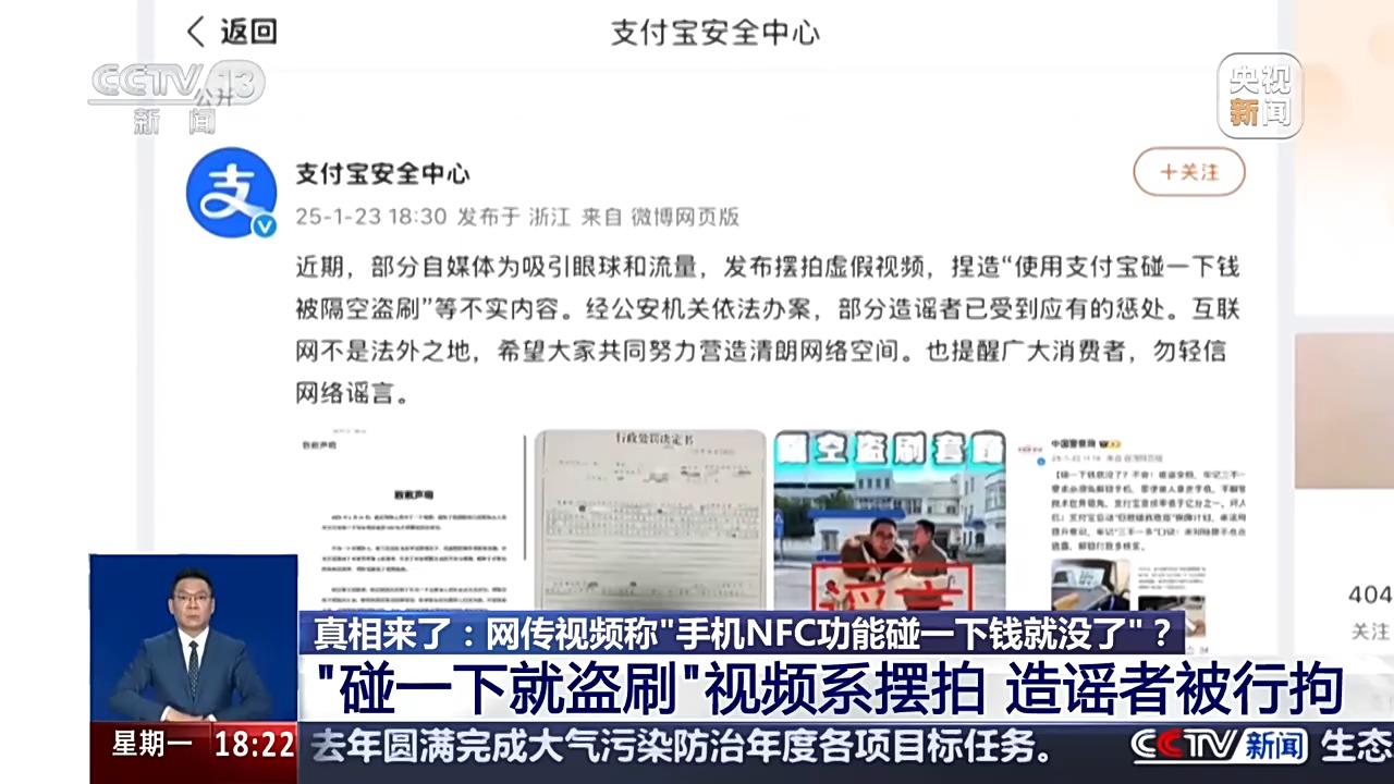 移动支付、刷公交卡、电子门禁,日常生活中智能手机的近场通信技术,也就是大家常说的NFC功能,为我们带来很多便利。近期,网络上出现了一些声称“通过近距离接触的支付方式,导致手机里的钱被隔空盗刷”的短视频,这些视频发布后,引起了网友的广泛热议。隔空盗刷,“碰一下钱就没了”是真的吗? “碰一下就盗刷”视频系摆拍 造谣者被行拘 视频中,这名短视频博主在多个网络平台发布视频称,自己的助理吃完饭后使用了某支付软件的“碰一下”便捷支付方式进行结账,结账后,助理将手机放回口袋里时被一个经过的陌生人使用伪装的POS机盗刷了500块钱,其后他们通过报警的方式将钱款追回。