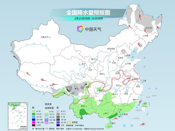 今明天(2月25日至26日),南方仍有较大范围降水。华南部分地区将现中雨,有利于缓和当地气象干旱,同时西藏等地部分地区还会有雨雪天气。后天,南方大部降水将短暂停歇。随着冷空气退却,南北方陆续开启大回暖,黄淮及其以南不少地方本月底最高气温将超20℃,江南多地有望入春。 南方今明天仍有较大范围阴雨 后天降水暂歇 昨天,我国降水主要出现在中西部部分地区,西藏等局地现大雪。监测显示,青海东部、甘肃南部、宁夏南部、川西高原北部、西藏东部等地部分地区出现小到中雪或雨夹雪,局地大雪。云南南部、四川东南部、西藏东南部等地部分地区出现中到大雨,云南西双版纳等地局地暴雨。 今明天,南方仍有较大范围降水,同时西藏等地部分地区还会有雨雪天气。后天,南方大部降水将短暂停歇。 具体来看,中央气象台预计,今天,内蒙古东北部、黑龙江中西部、新疆西部、西藏东部和南部、川西高原中南部等地部分地区有小到中雪或雨夹雪,其中,新疆南疆盆地西部、西藏东南部、川西高原中部等地局地有大雪。西南地区东部和南部、西藏南部、江南西部、华南等地部分地区有小到中雨,其中,西藏南部局地有大雨。