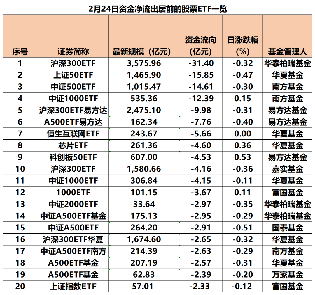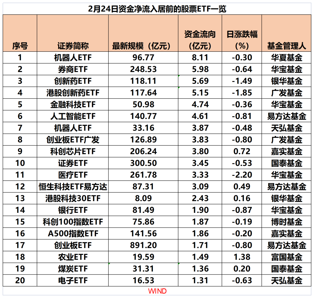 昨日,A股三大指数小幅下跌,农业、基建股表现活跃。股票ETF(含跨境ETF)整体净流出资金超百亿元,机器人、券商、创新药、人工智能相关ETF“霸榜”资金净流入排行榜,多只沪深300ETF、上证50ETF、中证500ETF、中证1000ETF等宽基ETF产品资金净流出居前。 单日股票ETF资金净流出超百亿元 2月24日,A股市场全天震荡调整,三大指数小幅下跌。截至收盘,沪指跌0.18%,深成指跌0.08%,创业板指跌0.67%。板块方面,机场航空、工程机械、农业、国资云等板块涨幅居前,智谱AI、教育、元件、CPO等板块跌幅居前。 2月24日,股票ETF(含跨境ETF)整体资金净流出100.92亿元。其中,创业板指数净流入1.0亿元、科创板指数净流出2.4亿元、科创创业50指数净流出2.5亿元、中证A50指数净流出1.8亿元。 从具体指数及对应产品申赎情况来看,净流入前五板块分别为机器人(净流入13.6亿元)、医药(净流入13.5亿元)、黄金(净流入12.1亿元)、非银金融(净流入10.0亿元)、计算机(净流入9.7亿元)。 同时,沪深300指数净流出53.8亿元、中证A500指数净流出38.7亿元、中证1000指数净流出22.3亿元、中证500指数净流出21.3亿元、上证50指数净流出16.3亿元。 从基金公司来看,易方达基金ETF流通份额最新规模达6192.6亿元,昨日净流出11.1亿元。具体来看,人工智能ETF(代码:159819)净流入4.61亿元,恒生科技ETF易方达(代码:513010)净流入3.09亿元,黄金ETF(代码:159934)净流入1.8亿元,创业板ETF(代码:159915)净流入1.71亿元,港股通医药ETF(代码:513200)净流入1.2亿元。 机器人、人工智能相关ETF资金净流入居前 2月24日,机器人、券商、创新药、人工智能相关ETF“霸榜”资金净流入排行榜。例如,华夏机器人ETF单日净流入达8.11亿元,紧随其后的是华宝券商ETF、银华创新药ETF、广发港股创新药ETF,单日“吸金”均超5亿元。