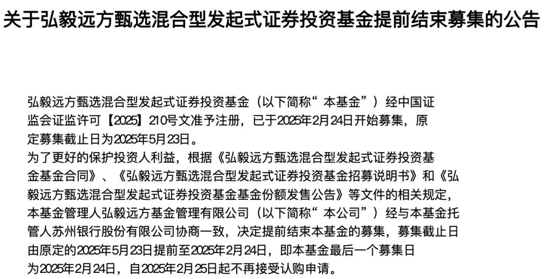 【导读】近期,批量新发权益基金提前结束募集 中国基金报记者 天心 农历蛇年以来,随着股市逐步回暖,不少新发权益基金提前结束募集,有的更是一日结募。 为把握布局良机,不少新基金加快了建仓节奏。 权益基金批量提前结募 2月25日,弘毅远方基金发布公告称,弘毅远方甄选混合于2月24日开始募集。为更好地保护持有人利益,根据相关规定,决定提前结束本基金的募集,募集截止日由原定的5月23日提前至2月24日。这意味着这只发起式基金仅发行一天便结束募集。