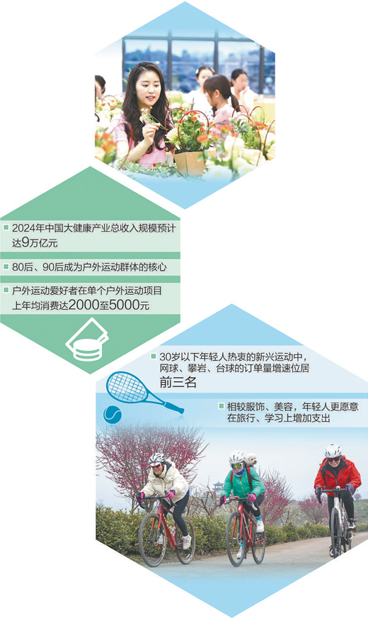 上图:四川宜宾,年轻人在体验插花艺术。 王宇摄(影像中国) 下图:骑行爱好者在安徽芜湖户外骑行。 肖本祥摄(影像中国) 数据来源:《健康产业消费趋势发展报告》等 制图:张芳曼 核心阅读 “一边熬夜内卷,一边养生保健”,如今,这样自嘲的年轻人,把健康消费当作新“刚需”。年轻人何以成为健康消费的生力军?充满商机的健康消费市场呈现哪些新看点、新活力?记者深入各类消费场景进行实地探访。 商场超市内,保健品、富含微量元素的食品持续热销;电商平台上,能量补给类、“轻养生”类零食备受追捧;中式养生馆,艾灸、拔罐、按摩等“国潮养生”预约火爆;户外空间里,骑行、越野、冰雪运动等吸引众多年轻人投身其中,砸下“真金白银”……如今,青年群体日益成为健康消费的生力军,打开了个性化、品质化的商业新空间,带来新的消费增长点。 康养受追捧 饮料火锅沐浴露 融入养生新理念 曾经,“康养”一词基本专属于中老年人。如今,青年群体也不遑多让,争相加入“养生局”。 江西鹰潭信江新区居民周佳敏,尽管只有20岁出头,却懂得不少养生门道。平日里,她会自制薏仁红豆汤、银耳雪梨汤等滋补养生汤,用来代替奶茶、蛋糕等甜食,而烧烤、油炸食品等,她选择远离。周佳敏也会吃糖,但不是普通的糖,而是富铁软糖、叶黄素酯软糖等。网购低热、低脂、具有功能性的食品,健康膳食再搭配合理运动,这样的生活方式,让她觉得轻盈而有活力,愿意坚持下去。 青年群体更加关注自身健康、对康养产品需求旺盛,也给生产厂家提供了广阔市场机遇。他们纷纷“各显神通”,源源不断地创造优质供给。 近来,有缓解疲劳、改善睡眠等功能的保健食品在年轻人当中引发关注。“健康消费,也需要新概念。我们把中药材制成保健饮品,很受年轻消费者欢迎。”北京嘉桦生物技术有限公司董事长张学刚说。 相关市场调研显示,与上一代消费者相比,90后和00后更注重预防和保养,讲究“精细养生,即刻滋补”,在康养这件事上,认真不含糊。 中国社会科学院食品药品产业发展与监管研究中心主任张永建认为,更好的物质条件、更高的教育水平、更便捷的健康信息获取方式,以及慢性疾病低龄化案例的宣传普及等因素,让越来越多的年轻人更主动地管理起自我健康,以实现更高品质的生活。 如今,年轻人对健康服务的关注度持续提升,对健康产品的消费热情不断走高。美团、大众点评统计数据显示,去年底以来,“滋补养生类火锅”关键词搜索量增幅最快,而且25至30岁用户搜索热情最高;不少餐饮商户提前上线了品质团购套餐,成功招揽年轻顾客到店消费。快手电商2024年数据显示,在身体清洁领域,身体精油/皂、泡澡浴包、香水沐浴露的销售商品数、订单量均呈现年同比翻倍增长。个性化的沐浴产品需求,体现出人们对精细养生的深入追求。 年轻人健康消费方式精细化、多样化、便捷化,推动健康产业向上发展。中国消费者协会发布的《健康产业消费趋势发展报告》显示,2024年中国大健康产业总收入规模预计达9万亿元。 运动成风尚 骑行越野玩冰雪 打卡健身不断档 一场春雨过后,江西萍乡武功山云雾缭绕。 26岁的肖子旭和骑友们从萍乡城区出发,趁着雨后初晴,蹬着山地车,沿着萍乡武功山景区的大道骑行,享受户外的美好。“每次骑行,都像给身心充了电!”肖子旭说,自己骑行到武功山20次,骑行里程超过了1万公里,从防雾护目镜到减震手套,在骑行装备上的消费已超3000元,“为兴趣买单,值!” 在萍乡武功山景区,年轻人正成为户外运动消费主力军。芦万武旅游公路两侧,专业骑行道与健身步道如丝带般缠绕山间,吸引着各地骑友。“过去游客来武功山就是爬山,现在骑行、露营都成了标配。”萍乡武功山风景名胜区管委会副主任糜锋介绍,景区近年来通过举办国际帐篷季、越野挑战赛,承办环鄱阳湖国际自行车大赛等一系列户外赛事,年均接待各类户外运动爱好者超过百万人次,年轻人占比很高。 徒步、骑行、越野、溯溪……随着全民健身运动广泛开展,青年群体健身运动热情也持续高涨。国家体育总局发布的《中国户外运动产业发展报告(2023—2024)》显示,从消费水平看,户外运动爱好者年均消费保持在较高水平,在单个户外运动项目上的年均消费达2000至5000元。从消费群体看,80后、90后成为户外运动群体的核心。 无论寒暑,年轻人打卡健身不断档。美团数据显示,去年底以来,运动健身的搜索量同比增长70%,其中,20至30岁的年轻用户占比近六成,平台上的健身房月卡、24小时健身房、自助健身等新潮供给,深受年轻人青睐。在30岁以下年轻人热衷的新兴运动方面,网球、攀岩、台球的订单量增速位居前三名。 随着冰雪经济持续走热,冰雪运动更成为青年消费的热点领域。 在宁夏固原市雅豪滑雪场游客大厅,一排排雪鞋、雪板、头盔等物品摆放整齐,三五成群的滑雪爱好者正做着准备活动。该雪场设有9条滑道,满足不同水平滑雪者的需求,另有专用缆车索道,为滑雪者提供便利的交通方式。“今年有很多外地年轻人来消费,针对他们的需求,我们加宽了中级道,加长了雪圈道,对夜场雪道照明设施也进行了全面升级。”滑雪场相关负责人汪友庭表示。 目前,宁夏的大型冰雪运动场超过20处,每年能举办超过30场次冰雪赛事。“随着冬季体育设施的完善,以及冰雪文化的普及