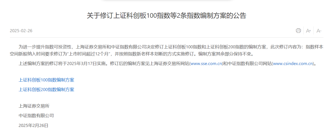 2月26日,上海证券交易所与中证指数公司联合发布公告称,拟对上证科创板100指数和上证科创板200指数进行编制方案修订,即将新股纳入时间要求修订为“上市时间超过12个月”,并按照指数新老样本划断的方式实施修订。上述编制方案的修订将于3月17日实施。 上交所表示,科创板市场发展日益成熟,此举旨在更好反映科创板上市公司的整体表现,进一步统一科创板宽基指数编制规则,提升指数可投资性。