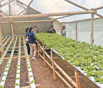在当地一家小型水培温室里,参观者在学习水培技术。