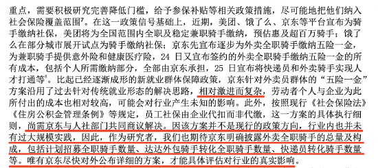 近日,中国人民大学劳动人事学院新就业研究课题组发布《以骑手为代表的新就业群体研究报告》,建议京东尽快对外公布为“全职骑手缴纳‘五险一金’且个人缴纳部分由京东承担”的详细方案,明确披露拟招聘“外卖全职骑手的总数量及构成”,认为这有助于具体评估该方案对数字经济中灵活就业群体和劳动用工行业的真实影响。 “(京东)方案并不是现行的政策方向,行业内也并未有过大规模实践,我们也期待京东明确披露外卖全职骑手的总量及构成,包括计划招募全职骑手数量、达达外包骑手转化全职骑手数量、快递员转化骑手数量等。”中国人民大学劳动人事学院新就业研究课题组建议,京东尽快对外公布详细方案,也有助于具体评估对行业的真实影响。” 针对京东宣布的为外卖骑手承担个人部分“五险一金”成本,课题组认为,按照现行《社会保险法》《住房公积金管理条例》等规定,员工社保由企业代扣而非代缴,京东这一方案并非现行政策方向,行业内也未有过大规模实践,具体的执行细节尚需京东与人社部门共同商议解决。