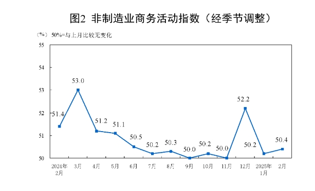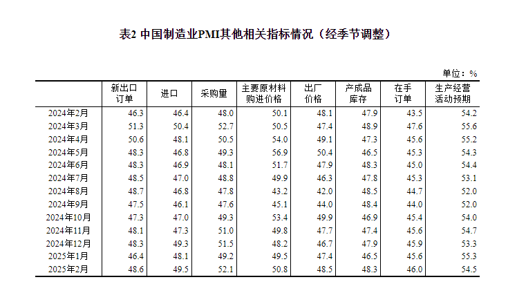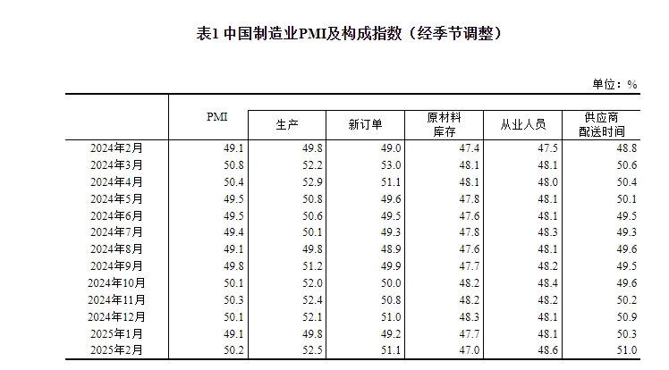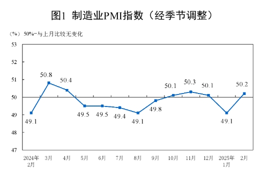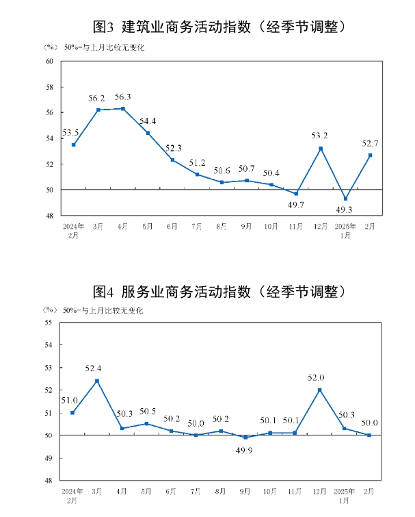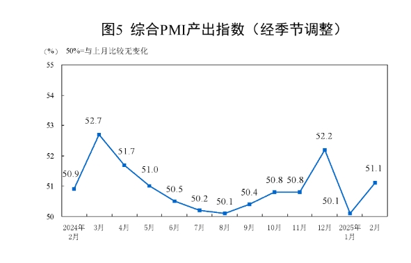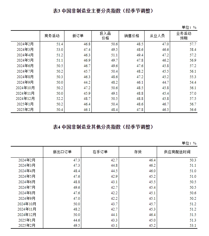 一、中国制造业采购经理指数运行情况 2月份,制造业采购经理指数(PMI)为50.2%,比上月上升1.1个百分点,制造业景气水平明显回升。 ![]() 从企业规模看,大型企业PMI为52.5%,比上月上升2.6个百分点,高于临界点;中、小型企业PMI分别为49.2%和46.3%,比上月下降0.3和0.2个百分点,均低于临界点。 从分类指数看,在构成制造业PMI的5个分类指数中,生产指数、新订单指数和供应商配送时间指数高于临界点,原材料库存指数和从业人员指数低于临界点。 生产指数为52.5%,比上月上升2.7个百分点,表明制造业企业春节后生产活动较快恢复。 新订单指数为51.1%,比上月上升1.9个百分点,表明制造业市场需求景气水平回升。 原材料库存指数为47.0%,比上月下降0.7个百分点,表明制造业主要原材料库存量降幅有所扩大。 从业人员指数为48.6%,比上月上升0.5个百分点,表明制造业企业用工景气度改善。 供应商配送时间指数为51.0%,比上月上升0.7个百分点,表明制造业原材料供应商交货时间加快。 ![]() ![]() 二、中国非制造业采购经理指数运行情况 2月份,非制造业商务活动指数为50.4%,比上月上升0.2个百分点,非制造业景气水平小幅回升。 ![]() 分行业看,建筑业商务活动指数为52.7%,比上月上升3.4个百分点;服务业商务活动指数为50.0%,比上月下降0.3个百分点。从行业看,航空运输、邮政、电信广播电视及卫星传输服务、货币金融服务、资本市场服务等行业商务活动指数均位于55.0%以上较高景气区间;零售、住宿、餐饮等行业商务活动指数均低于临界点。 ![]() 新订单指数为46.1%,比上月下降0.3个百分点,表明非制造业市场需求景气水平有所回落。分行业看,建筑业新订单指数为46.8%,比上月上升2.1个百分点;服务业新订单指数为45.9%,比上月下降0.8个百分点。 投入品价格指数为48.4%,比上月下降2.0个百分点,表明非制造业企业用于经营活动的投入品价格总体水平低于上月。分行业看,建筑业投入品价格指数为49.3%,比上月上升1.6个百分点;服务业投入品价格指数为48.2%,比上月下降2.7个百分点。 销售价格指数为47.8%,比上月下降0.8个百分点,表明非制造业销售价格总体水平较上月下降。分行业看,建筑业销售价格指数为49.1%,比上月上升1.3个百分点;服务业销售价格指数为47.6%,比上月下降1.2个百分点。 从业人员指数为46.5%,比上月下降0.2个百分点,表明非制造业企业用工景气度小幅回落。分行业看,建筑业从业人员指数为45.6%,比上月下降3.1个百分点;服务业从业人员指数为46.7%,比上月上升0.4个百分点。 业务活动预期指数为56.6%,比上月略降0.1个百分点,仍高于临界点,表明多数非制造业企业对市场预期较为乐观。分行业看,建筑业业务活动预期指数为54.7%,比上月下降1.8个百分点;服务业业务活动预期指数为56.9%,比上月上升0.1个百分点。 ![]() 三、中国综合PMI产出指数运行情况 2月份,综合PMI产出指数为51.1%,比上月上升1.0个百分点,表明我国经济景气水平总体回升。 ![]() 附注 1、主要指标解释 采购经理指数(PMI),是通过对企业采购经理的月度调查结果统计汇总、编制而成的指数,它涵盖了企业采购、生产、流通等各个环节,包括制造业和非制造业领域,是国际上通用的监测宏观经济走势的先行性指数之一,具有较强的预测、预警作用。综合PMI产出指数是PMI指标体系中反映当期全行业(制造业和非制造业)产出变化情况的综合指数。PMI高于50%时,反映经济总体较上月扩张;低于50%,则反映经济总体较上月收缩。 2、调查范围 涉及《国民经济行业分类》(GB/T4754-2017)中制造业的31个行业大类,3200家调查样本;非制造业的43个行业大类,4300家调查样本。 3、调查方法 采购经理调查采用PPS(Probability Proportional to Size)抽样方法,以制造业或非制造业行业大类为层,行业样本量按其增加值占全部制造业或非制造业增加值的比重分配,层内样本使用与企业主营业务收入成比例的概率抽取。 本调查由国家统计局直属调查队具体组织实施,利用国家统计联网直报系统对企业采购经理进行月度问卷调查。 4、计算方法 (1)分类指数的计算方法。制造业采购经理调查指标体系包括生产、新订单、新出口订单、在手订单、产成品库存、采购量、进口、主要原材料购进价格、出厂价格、原材料库存、从业人员、供应商配送时间、生产经营活动预期等13个分类指数。非制造业采购经理调查指标体系包括商务活动、新订单、新出口订单、在手订单、存货、投入品价格、销售价格、从业人员、供应商配送时间、业务活动预期等10个分类指数。分类指数采用扩散指数计算方法,即正向回答的企业个数百分比加上回答不变的百分比的一半。由于非制造业没有合成指数,国际上通常用商务活动指数反映非制造业经济发展的总体变化情况。 (2)制造业PMI指数的计算方法。制造业PMI是由5个扩散指数(分类指数)加权计算而成。5个分类指数及其权数是依据其对经济的先行影响程度确定的。具体包括:新订单指数,权数为30%;生产指数,权数为25%;从业人员指数,权数为20%;供应商配送时间指数,权数为15%;原材料库存指数,权数为10%。其中,供应商配送时间指数为逆指数,在合成制造业PMI指数时进行反向运算。 (3)综合PMI产出指数的计算方法。综合PMI产出指数由制造业生产指数与非制造业商务活动指数加权求和而成,权数分别为制造业和非制造业占GDP的比重。 5、季节调整 采购