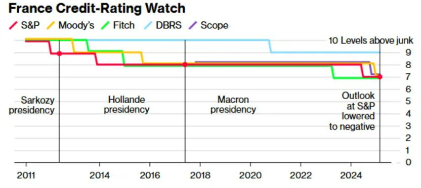 标普为何调低展望? 在标普全球的声明中表示,法国2025年预算主要依靠临时性税收措施来实现约0.4%的GDP赤字削减。然而,2025年之后的财政战略仍不明确。标普全球评级还预测,法国今年GDP增长将降至1%以下,这将进一步加剧财政前景的压力。 标普预计,到2028年,法国的平均债务成本将与名义GDP增长持平。为了降低债务与GDP之比,法国需要实现基本预算盈余,而这是自2001年以来从未实现过的。由于这些财政压力和改革缺乏政治支持,法国的主权评级展望被标普调整为负面。 负面展望反映了在经济增长前景不确定的背景下,政府债务上升,同时缺乏强有力的政治共识来解决法国巨大的潜在预算赤字问题。标普全球评级警告称,如果政府在未来两年内未能进一步减少其巨额预算赤字,或者经济增长长期低于预期,评级可能会被下调。 另一方面,如果法国的预算赤字收窄速度快于预期,且经济增长加速,导致净政府债务与GDP之比呈下降趋势,评级则可能会上调。 对于标普全球的最新声明,法国财政部回应称,2025年预算标志着减少预算赤字和控制债务努力的“历史性转折点”。法国财政部表示:“负面前景提醒我们,修复公共财政面临的挑战有多大,这是政府决心迎接的挑战。”