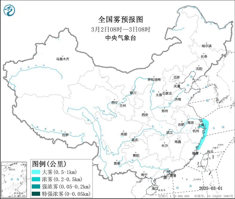 中央气象台3月2日06时继续发布大雾黄色预警: 预计,3月2日白天至夜间,长江口及杭州湾附近海域、舟山群岛附近海域、浙江沿岸海域、上海港、宁波港将有能见度不足1公里的浓雾。