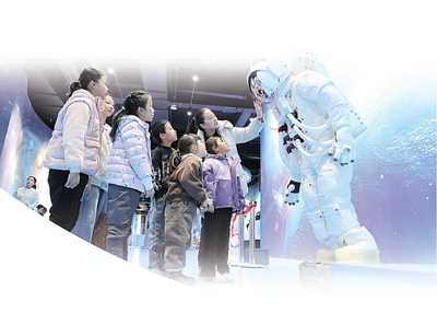甘肃张掖临泽县的小朋友在科技馆了解航天服的功能和构造。 张渊摄(人民视觉)