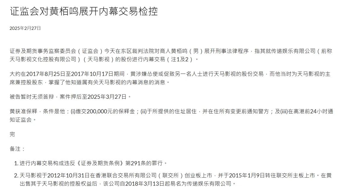 8年前的一起内幕交易案真相近日浮出水面。 2月27日,据香港证监会披露,香港证监会在东区裁判法院对香港知名艺人黄栢鸣(即黄百鸣)展开刑事法律程序,指控其涉嫌就传递娱乐(此前名为“天马影视文化控股有限公司”,下称“天马影视”)的股份进行内幕交易。 公开资料显示,黄百鸣,是中国香港的男导演、监制、编剧、演员,其从影多年,参与电影超过100部,包括喜剧《最佳拍档》《开心鬼》《家有喜事》,动作片《叶问》,以及《赏金猎人》《反贪风暴2》等。 受访人士认为,根据香港《证券及期货条例》第291条,黄百鸣可能面临监禁和罚款。不过,未来具体的判罚仍将取决于法院对案件情节的认定,包括内幕交易的性质、涉及金额、对市场的影响等因素。 股价一度“过山车” 2月27日,香港证监会对香港知名艺人黄百鸣展开内幕交易检控,认定其内幕交易违反了香港《证券及期货条例》第291条。