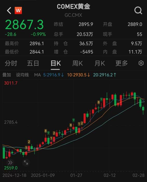 屡创新高后,“金价大跳水”冲上微博热搜。 本周,自盘中再次刷新历史新高后,国际金价呈下降趋势,自高点回落超100美元。截至当地时间2月28日收盘,COMEX黄金期货跌0.99%,报2867.3美元/盎司,本周累计跌幅达2.91%;伦敦金现跌0.68%,报2856.998美元/盎司,本周累计跌幅达2.66%。