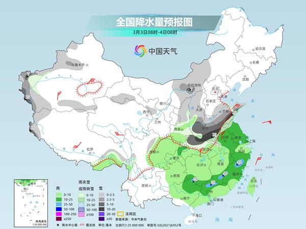 今天(3月3日),我国中东部大范围雨雪持续,部分地区有大到暴雪,明后天,我国降水总体有所减弱,但降水范围仍然较大,需注意防范雨雪天气对交通出行等方面的不利影响。在寒潮和降水影响下,今天江南等地将现“跨季式”降温,多地气温降幅可达20℃左右,体感由初夏回到冬天,公众请注意添衣保暖。 大范围雨雪过程持续 山东河南等地部分地区有大到暴雪 昨天,寒潮南下过程中与强盛的暖湿气流交汇,给我国带来大范围较强雨雪,多地还伴有强对流天气。监测显示,宁夏、陕西北部、山西南部、河北南部、山东、河南北部和西部等地出现中到大雪、雨夹雪或雨转雪天气,山东中北部和西部等地部分地区暴雪到大暴雪。安徽北部和西南部、江苏中北部、河南南部、湖北东部和西部、重庆东南部、贵州东北部、湖南北部等地部分地区出现大雨或暴雨,湖南湘西局地大暴雨。 今天,我国中东部地区大范围雨雪过程还将持续,主要降雪区域有所南压,山东、河南、湖北等地部分地区暴雪。明天,中东部地区降水减少、减弱,新疆等地降雪增多。后天,西北地区等地部分地区还将有较强降雪。 具体来看,中央气象台预计,今天,黄淮大部、华北西部和南部、内蒙古中部、安徽北部、江苏北部、湖北北部以及新疆伊犁河谷和南疆西部山区、西藏西部等地部分地区有小到中雪或雨夹雪,其中,山东南部、河南中南部、安徽西北部、湖北西北部等地部分地区有大到暴雪。江淮大部、江南、西南地区东部和南部、华南大部、台湾岛等地部分地区有小到中雨,其中,江西南部、浙江南部、福建北部、广西东北部、广东西北部等地部分地区有大雨。