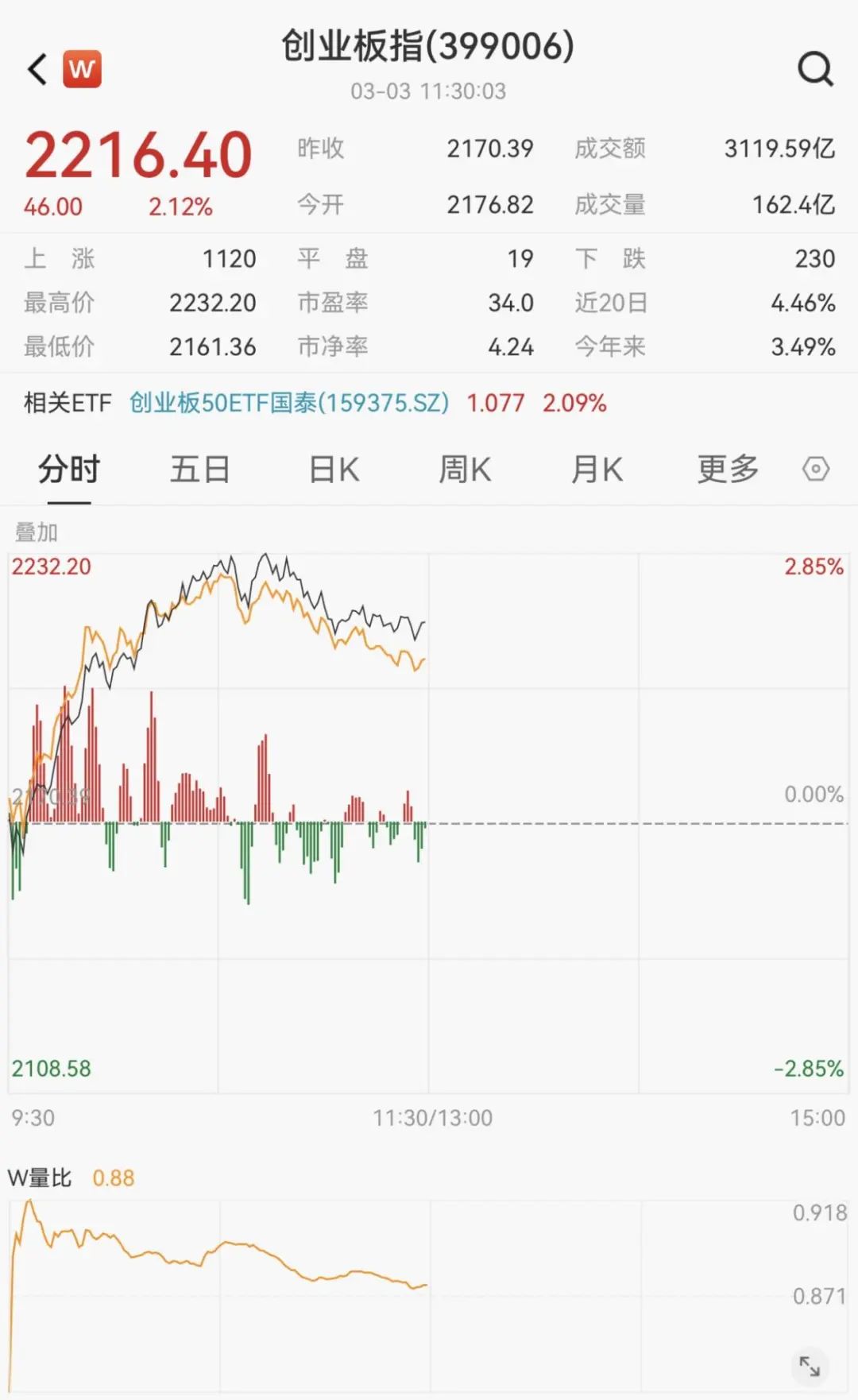 【导读】锂电池产业链全线爆发,化工板块多股涨停 一起来看下上午的市场情况及资讯。 3月3日,A股三大指数集体高开,随后震荡拉升,截至午间收盘,沪指涨0.34%,深成指涨1.08%,创业板指涨2.12%。