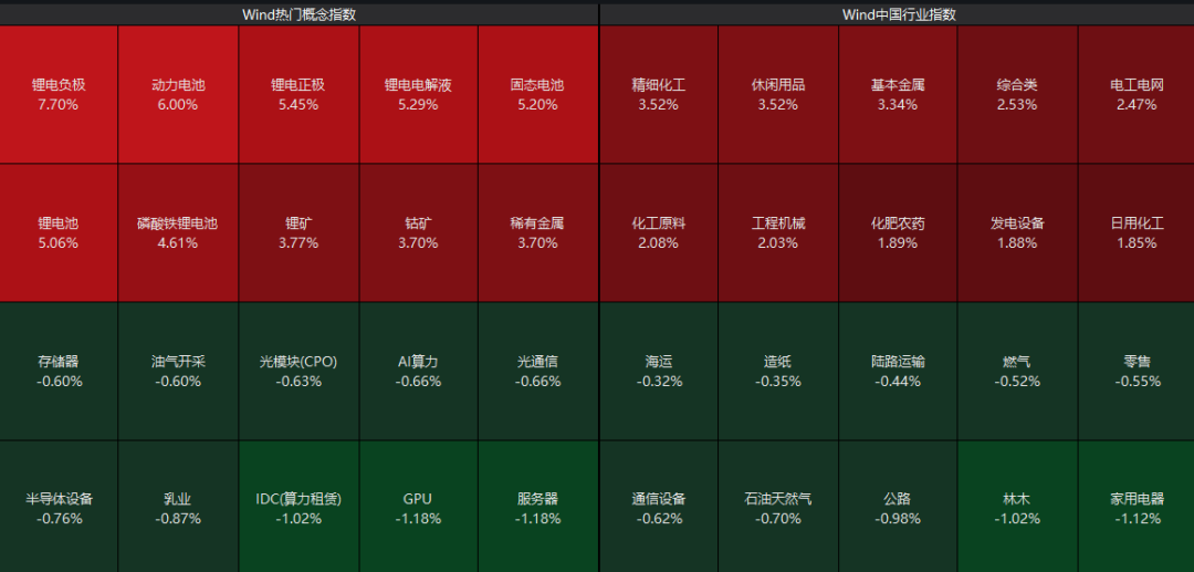 板块上来看,锂电及相关产业链强势走高,固态电池、化工、AI医疗等板块涨幅居前;而家用电器、算力租赁、半导体设备等板块跌幅居前。