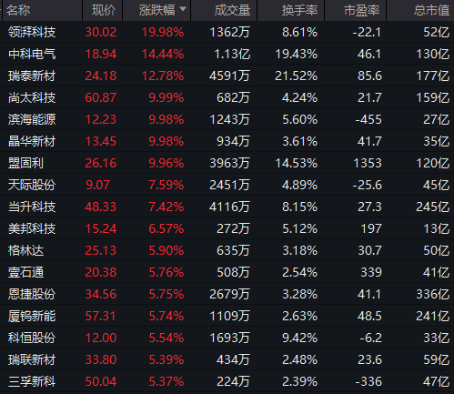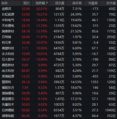 锂电池产业链全线爆发 锂电池及相关产业链强势走高,金银河实现20CM涨停,长虹能源、天宏锂电、中科电气涨幅居前,亿纬锂能涨超8%,宁德时代涨超4%。
