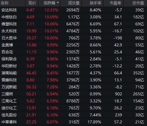 此外,化工原料板块表现活跃,中核钛白、佛塑科技、永太科技等多股涨停。