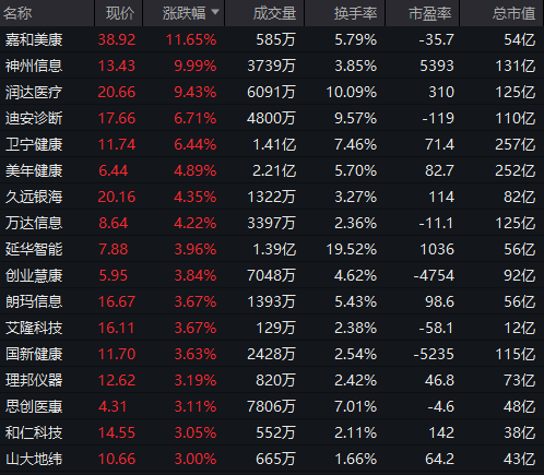 光大证券表示,低空经济是战略性新兴产业,人形机器人产业化进程有望加速,有望带动化工新材料打开需求成长空间。伴随低空经济的发展,碳纤维、PEEK等轻量化材料将有望迎来新机遇。 AI医疗概念再度活跃 AI医疗概念再度活跃,神州信息涨停,润达医疗、迪安诊断、卫宁健康等跟涨。