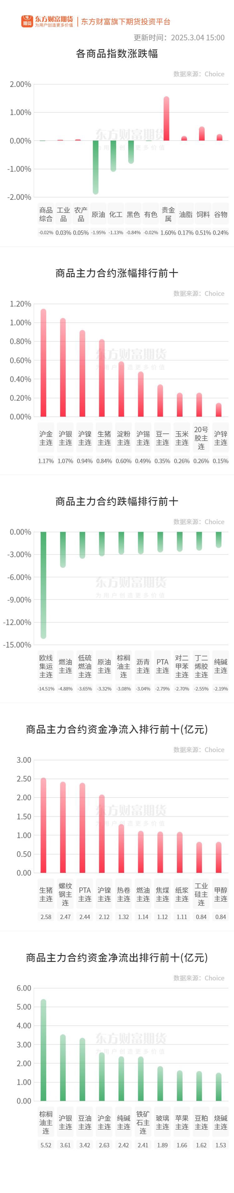 行情纵览![]() 宏观要闻财政部:根据《中华人民共和国关税法》、《中华人民共和国海关法》、《中华人民共和国对外贸易法》等法律法规和国际法基本原则,经国务院批准,自2025年3月10日起,对原产于美国的部分进口商品加征关税。有关事项如下:一、对鸡肉、小麦、玉米、棉花加征15%关税,二、对高粱、大豆、猪肉、牛肉、水产品、水果、蔬菜、乳制品加征10%关税,三、对原产于美国的附件所列进口商品,在现行适用关税税率基础上分别加征相应关税,现行保税、减免税政策不变,此次加征的关税不予减免。 财联社:国务院新闻办公室将于2025年3月5日(星期三)上午11时30分举行吹风会,请《政府工作报告》起草组负责人、国务院研究室主任沈丹阳,《政府工作报告》起草组成员、国务院研究室副主任陈昌盛解读《政府工作报告》,并答记者问。 新华社:美国总统特朗普3日说,拟对墨西哥和加拿大加征25%关税的措施将于4日生效。特朗普当天在白宫回答媒体相关提问时作出上述表态。他说,墨西哥和加拿大“必须”在美国设立汽车工厂和其他设施,“这样他们就不必支付关税”。特朗普还表示,“对等关税”将于4月2日生效。 品种资讯黑色系期货 钢材:据不完全统计,3月4日约有6家钢厂调整建材出厂价格,螺纹钢价格最高下调30元/吨。(西本新干线) 铁矿石:3月4日中国47港进口铁矿石库存总量15216.04万吨,较上周一下降661.88万吨。 卫星数据显示,2024年2月24日-3月2日期间,澳大利亚、巴西七个主要港口铁矿石库存总量1244.5万吨,环比下降133.6万吨,目前库存绝对量略低于年初以来的平均值。(Mysteel) 农产品期货 白糖:3月4日,我国以进口巴西原糖为原料生产的白糖其销售利润约为1832元/吨(关税配额内,15%关税)或482元/吨(关税配额外,50%关税);我国以进口泰国原糖为原料生产的白糖其销售利润约1921元/吨(关税配额内,15%关税)或598元/吨(关税配额外,50%关税)。(Mysteel) 生猪:截至3月4日14:00时,全国农产品批发市场猪肉平均价格为20.71元/公斤,比昨天下降0.5%。(农业农村部) 玉米:中储粮集团公司发布公告称,按照有关部门工作安排,中储粮集团公司及所属相关企业近期将继续增加新一批收储库点,主要安排在东北地区,部分安排在南方省份,进一步扩大2024年国产玉米收储规模,新增收购库点等信息将及时通过所在地媒体或相关交易平台向社会公布。(人民财讯) 有色/贵金属期货 碳酸锂:电池级碳酸锂指数价格74909元/吨,环比上一工作日下跌166元/吨;电池级碳酸锂7.39-7.6万元/吨,均价7.495万元/吨,环比上一工作日下跌150元/吨;工业级碳酸锂7.25-7.35万元/吨,均7.3万元/吨,环比上一工作日下跌150元/吨。(SMM) 黄金:摩根大通预测,到2025年第四季度,金价可能接近每盎司3000美元,这加强了其对这种贵金属的长期结构性看涨看法。(新华财经) 沪铜:摩根大通发布报告称,预计全球精炼铜的供应缺口将在2026年扩大至16万吨,并维持对明年铜价的预测,即2026年铜价平均为每吨1.1万美元左右。(财联社) 能化期货 尿素:3月4日国内尿素行情涨跌互现,部分地区调整幅度10-100元/吨不等。(农时达情报) 山东地区尿素行情小幅波动,小颗粒主流出厂成交1760-1810元/吨,大颗粒出厂报价2200-2220元/吨。临沂市场一手贸易商出货参考价格1810-1820元/吨附近,菏泽市场参考价格1780-1790元/吨附近。省内企业生产基本正常。(隆众资讯) 原油:欧佩克代表称,欧佩克+将继续推进4月石油增产计划。欧佩克+将在4月继续执行每日增产13.8万桶的计划,这将是为恢复停产两年多的产量而进行的一系列月度增产中的首次增产,到2026年产量将逐步恢复到每天220万桶。原油交易商此前普遍预计欧佩克+将再次推迟增产,自去年6月首次宣布以来,欧佩克+已三次推迟。(财联社) 晚间关注18:00 欧盟27国:季调后失业率 (文章来源:东方财富研究中心) |