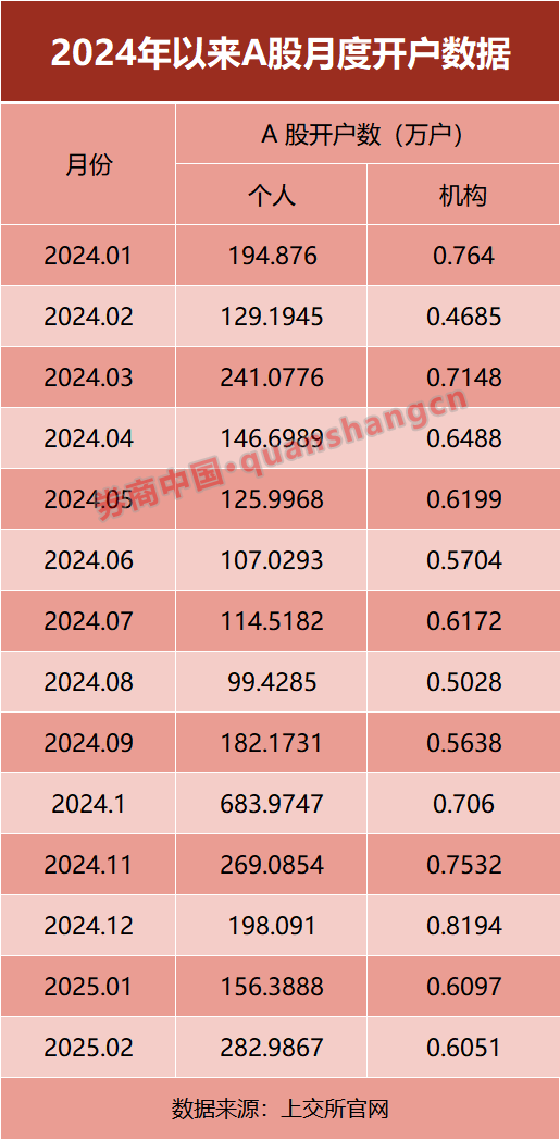 上交所最新发布的数据显示,今年2月A股新开户数为283.59万户,相比1月的157万户大增80.6%。 值得一提的是,2月份283.59万户的新开户数,相比前几个月呈现明显放量。从2023年4月至今,这一数字也仅次于去年10月的684.68万户。 A股投资者新增开户数量的走高往往与市场行情大涨相辅相成。从行情来看,今年2月各大指数普遍上涨,人工智能、DeepSeek、人形机器人等板块持续活跃,市场日均成交额达1.84万亿元。 2月A股新开户283.59万户 由于2月交易日天数较少(今年为18个交易日),往年2月往往是开户数据的低谷期。但蛇年春节后A股市场人气火爆,2月新开户数据也创下近几个月的小高峰。 上交所最新发布的数据显示,今年2月A股新开户数为283.59万户,相比1月的157万户大增80.6%。其中,个人投资者新开A股账户达282.99万户,机构投资者新开户数为6051户。