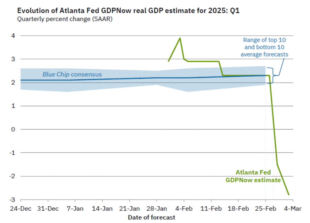 危险信号! 一份来自亚特兰大联储的GDP预测,让投资者再度担心美国的经济前景。如果美国一季度的GDP增速如模型预测萎缩2.825%,那将是新冠疫情后美国经济首次出现负增长。 市场上,美股三大指数集体低开,截至发稿,道指跌0.96%,纳指跌1.19%,标普500指数跌1.01%。 此外,欧洲股市亦集体下跌,截至发稿,德国DAX指数跌近3%,法国CAC40指数跌近2%,英国富时100指数跌近1%。 连续下调美国一季度GDP增速 当地时间3月3日,亚特兰大联储的GDPNow模型对美国2025年第一季度的GDP预测为萎缩2.825%,该数据是自2020年新冠疫情以来最糟糕的美国GDP预测。 ![]() 上周五,GDPNow模型就将美国第一季度GDP预期为收缩1.5%,而在一个月前,该模型的预测是增长2.33%。也就是说,短短一个月时间,该模型就连续做出美国一季度经济将出现大幅收缩的预测。 如果该模型的预测最终成真,那美国季度GDP将创下2020年二季度收缩7.5%后的最差表现。过去二十年,美国季度GDP仅在2008年金融危机和2020年新冠疫情期间出现过收缩。 ![]() 据了解,上周五的预测主要基于美国贸易逆差的扩大。根据美国商务部发布的数据,美国1月商品贸易逆差创纪录地扩大至-1530亿美元,而市场预期为-1160亿美元,贸易逆差的急剧扩大主要是由于美国企业在关税生效前抢购进口商品有关。此外,还有相当一部分逆差是由黄金进口激增所推动的。 而最新的预测和上周五不同,亚特兰大联储一季度GDP预测之所以从-1.5%暴跌至-2.8%,部分归因于周一公布的美国ISM制造业调查数据下滑:ISM制造业指数从50.9(扩张)下降至50.3(仍然处于扩张状态)。此外,美国人口普查局(Census Bureau)和供应管理学会(ISM)公布数据同样不乐观:第一季度实际个人消费支出增长(PCE)和实际私人固定投资增长的预测分别从1.3%和3.5%下降至0.0%和0.1%。 但分析师对此模型的有效性也有疑问。财经博客ZeroHedge质疑称,仅仅0.6个百分点的ISM制造业指数下降,不应该就能让亚特兰大联储的经济增长预测跌至新冠疫情以来的最衰退水平。 亚特兰大联储也强调,随着更多月度数据的出现,特定季度的GDPNow预测会不断发展,并且通常会变得更加准确。此外,亚特兰大联储GDPNow预测是一个模型预测,并非亚特兰大联储,其行长,或者美联储的官方预测。 美政府官员高度紧张 今年1月20日,特朗普宣誓就任美国新一任总统,并开始大刀阔斧进行改革。如果一季度经济出现收缩,对其声誉将影响巨大。 美国财政部长贝森特就曾为特朗普对经济的负面影响进行过辩护。他认为,所有这一切都会被外界过于简单地归咎于特朗普(以及马斯克)的政策。但贝森特强调:“我们正在经历拜登四年过度支出后的后遗症。只有6到12个月后,美国才会正式进入特朗普经济时间。” 而分管美国经济分析局的商务部长卢特尼克公开表示,决定经济是否衰退的指标要调整口径了。 美国经济分析局是负责发布GDP数据的机构。卢特尼克上周日接受福克斯新闻采访时表示,准备把政府支出从GDP报告中剔除出去。不过他并没有提及何时会进行调整。这位美国商务部长声称:“你知道,美国政府历史上曾经干预过GDP,他们将政府支出计入GDP的一部分。因此,我将把这两者分开,使其透明化。” (文章来源:证券时报) |