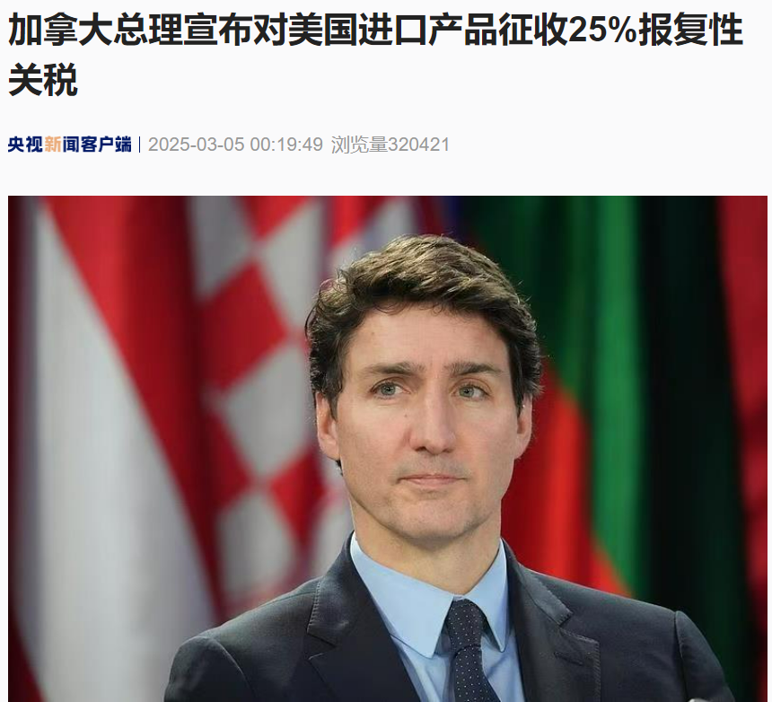 据央视新闻3月5日消息,当地时间3月4日,加拿大总理特鲁多宣布,对从美国进口的产品征收25%的报复性关税。 ![]() 图片来源:央视新闻 特鲁多在记者会上重申,面对关税,加拿大人不会退缩,加拿大将立即对价值300亿加元的美国进口商品征收25%的报复性关税,将在21天后对价值1250亿加元的美国进口商品征收25%的报复性关税。 特鲁多说,加拿大将向世界贸易组织和“美国-墨西哥-加拿大协定”(简称美墨加协定)提出申诉,同时加政府也正在与各省和地区讨论采取多项非关税措施以应对美国加征关税。 特鲁多表示,特朗普发动贸易战是“一件非常愚蠢的事情”,美国家庭和特朗普很快就会感受到加征关税的“破坏性”。 特鲁多说,特朗普声称的加美边境毒品问题是“不合理和虚假的借口”。特朗普之所以如此积极加征关税的原因是“希望看到加拿大经济彻底崩溃”,“因为这将使吞并我们变得更加容易,这是他下一步想法,但这永远不会发生。我们永远不会成为(美国的)第51个州”。 特鲁多表示,将为加拿大工人和企业提供更多支持。他还表示,将采取措施防止威胁加拿大公司的掠夺性行为。 特鲁多称,将寻找新的方式与墨西哥合作应对关税问题。他还表示,预计未来几天将与特朗普进行会谈。 据央视新闻,当地时间3月4日,美国总统特朗普在社交媒体上表示,加拿大对美征收报复性关税将立即引发美国“增加同等数额的对等关税”。 特朗普在其私人社交媒体平台发文称,“请转告加拿大总理特鲁多,若他对美国征收报复性关税,我们的对等关税将立即以同等数额增加。” 据央视新闻,欧盟委员会发言人奥洛夫·吉尔3月4日发表声明批评美国对加拿大和墨西哥加征关税,并呼吁美方重新考虑其贸易政策。 据媒体报道,吉尔在一封通过电子邮件发表的声明中说:“我们呼吁美国重新考虑其做法,并努力寻求一个有利于各方合作、基于规则的解决方案。”他强调,在国际合作比以往任何时候都更加重要的时刻,美国这一举措可能扰乱全球贸易,损害主要经济伙伴,并造成不必要的不确定性。 据央视新闻此前消息,当地时间3月3日,美国总统特朗普表示,美国对墨西哥和加拿大商品加征25%的关税将于3月4日生效。特朗普称,对墨西哥和加拿大的关税没有达成共识的空间。 当地时间3月3日,在美国总统特朗普证实将在4日对加拿大和墨西哥征收关税后,加拿大外交部长乔利表示,加拿大已经准备好一系列可以立即反击的报复性措施。 乔利表示,之前加拿大已经宣布准备好了对价值1550亿加元的美国商品征收报复性关税。首批报复性关税将涉及价值300亿加元的美国产品。 她表示,美国关税对加拿大而言是一个生存威胁。加拿大有数千个工作岗位处于危险之中。如果美国决定发动贸易战,加拿大已经做好了准备。 特朗普2月1日签署行政令,对进口自墨西哥、加拿大两国的产品加征25%的关税,其中对加拿大能源产品的加税幅度为10%。2月3日,特朗普宣布对两国加征关税措施暂缓30天实施,并继续进行谈判。2月27日,特朗普表示,对墨西哥和加拿大的关税措施仍将于3月4日实施。同一天,加拿大总理特鲁多表示,加拿大不希望与美国打贸易战,但如果美国3月4日对加拿大商品加征关税,加拿大“将立即做出极其强烈的回应”。