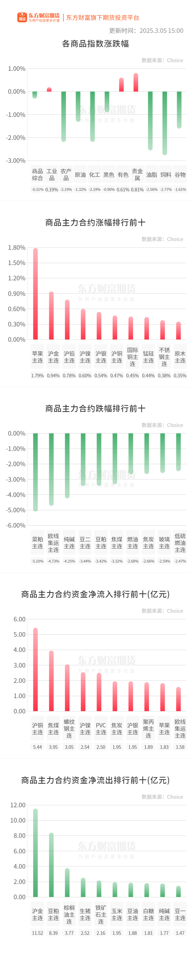 行情纵览![]() 宏观要闻新华社:国务院总理李强5日在政府工作报告中提出,今年发展主要预期目标是:国内生产总值增长5%左右;城镇调查失业率5.5%左右,城镇新增就业1200万人以上;居民消费价格涨幅2%左右;居民收入增长和经济增长同步;国际收支保持基本平衡;粮食产量1.4万亿斤左右;单位国内生产总值能耗降低3%左右,生态环境质量持续改善。 金融监管总局:为更好发挥股权投资对科技创新和民营企业发展的支持作用,3月5日,金融监管总局发布《关于进一步扩大金融资产投资公司股权投资试点的通知》(金办发〔2025〕19号),进一步优化完善试点政策。 央视新闻:美国和加拿大官员当地时间4日就可能取消关税举行会谈,相关协议最早可能在5日达成。知情人士透露,美国和加拿大官员4日全程保持联系,美国总统特朗普和加拿大总理特鲁多可能在5日就关税问题进行对话。美国商务部长卢特尼克当天稍早时表示,特朗普可能能够与加拿大和墨西哥达成某种折中协议,以减轻4日生效的关税所造成的影响。根据报道,卢特尼克还与加拿大安大略省省长道格·福特进行了交谈,卢特尼克在谈话中试图说服福特停止一些批评和报复性威胁。报道称,卢特尼克还与加拿大财政部长多米尼克·勒布朗在4日晚间进行了交谈。 品种资讯黑色系期货 钢材:3月5日,江苏南钢建筑钢材调价信息如下:螺纹:下调20元,现Φ16-20mm HRB400螺纹钢执行价3390元/吨;备注:12mm螺加100元、14mm加60元,22mm和25mm加30元、28mm、32mm加60元、抗震加30元、核电螺纹加50元;以上调整均为含税,自2025年3月5日起执行。(西本新干线) 铁矿石:据SMM进口矿成本利润表看,进口矿利润小幅上探;SMM高炉检修影响量最新数据显示,本周高炉检修铁水影响量环比上周减少11.26万吨,下周依旧有继续减少的趋势。铁水继续小幅回升中。对于矿价有一定支撑。关注两会内容对于铁矿石价格的短期影响,预计短期内进口矿成本利润或将弱稳运行。(SMM) 农产品期货 生猪:截至3月5日14:00时,全国农产品批发市场猪肉平均价格为20.83元/公斤,较前一日上升0.6%。(农业农村部) 鸡蛋:3月5日主产区山东鸡蛋均价6.94元/公斤,与昨日持平;河北鸡蛋均价6.57元/公斤,较昨日上涨0.03;广东鸡蛋均价7.33元/公斤,与昨日持平;北京鸡蛋均价7.4元/公斤,与昨日持平。(中国饲料行业信息网) 菜粕:截至2025年第9周,沿海油厂菜粕库存为3.7万吨,较上周增加0.30万吨 ;华东地区菜粕库存47.21万吨,较上周增加0.55万吨;华南地区菜粕库存为10万吨,较上周增加2.50万吨;全国主要地区菜粕库存总计60.91万吨,较上周增加3.35万吨。(Mysteel) 玉米:截至2025年2月28日,北方四港玉米库存共计504.3万吨,周环比增加23.8万吨;当周北方四港下海量共计90.1万吨,周环比减少8.10万吨。(Mysteel) 有色/贵金属期货 工业硅:3月5日,华东不通氧553#在10500-10600元/吨,均价下调50元/吨;通氧553#在10600-10700元/吨;521#在11000-11300元/ 吨,均价下调50元/吨;441#在10900-11200元/吨,均价下调50元/吨;421#在11300~11500元/吨,均价下调50元/吨; 421#有机硅用在11900-12300元/吨;3303#在11900-12000元/吨。昆明、黄埔港、天津港、西北、上海地区部分硅价小幅走弱。再生硅价格同样小幅走弱。(SMM) 碳酸锂:2025年2月智利碳酸锂出口数量为1.46万吨,环比减少43%,同比减少27%。其中出口到中国1.2万吨,环比减少37%,同比减少25%;出口到韩国的数量为2229吨,环比减少51.7%,同比增加22.5%;出口到日本293吨,环比同比均有减少。 电池级碳酸锂指数价格74787元/吨,环比上一工作日下跌122元/吨;电池级碳酸锂7.38-7.59万元/吨,均价7.485万元/吨,环比上一工作日下跌100元/吨;工业级碳酸锂7.24-7.34万元/吨,均7.29万元/吨,环比上一工作日下跌100元/吨。碳酸锂现货成交价格重心持续下移。(SMM) 沪铝:Mysteel对中国原铝生产企业进行全样本调研,2025年2月中国原铝产量初值335.47万吨,同比下降0.02%,环比下降9.77%;2月平均日产量为11.98万吨,环比小降0.01万吨(实产天数28天)。(Mysteel) 能化期货 尿素:山东地区尿素行情弱势运行,小颗粒主流出厂成交1760-1810元/吨,大颗粒出厂报价2200-2220元/吨。临沂市场一手贸易商出货参考价格1790-1810元/吨附近,菏泽市场参考价格1780-1790元/吨附近。(隆众资讯) 烧碱:SMM获悉,河南省主流氧化铝厂32%离子膜液碱长单采购价格较1-2月上调550元/吨,执行到厂价格3480-3630元/吨(折百)。(SMM) 今日,山东液碱市场部分上调,部分企业走货转好。近期关注重点依然在主力下游送货量及库存的变化上。鲁西南32%离子膜碱主流成交960-1010;鲁中东部32%离子膜碱主流成交920-970,50%离子膜碱主流成交1520-1610;鲁北地区32%离子膜碱主流成交963-1020;鲁南32%离子膜碱主流成交910-930。(单位:元/吨)(隆众资讯) 原油:特朗普再次呼吁在美国开采更多石油。(财联社) 美国至2月28日当周API原油库存减少145.5万桶,预期减少29万桶,前值减少64万桶。(财联社) 晚间关注18:00 欧盟27国:PPI当月同比 (文章来源:东方财富研究中心) |