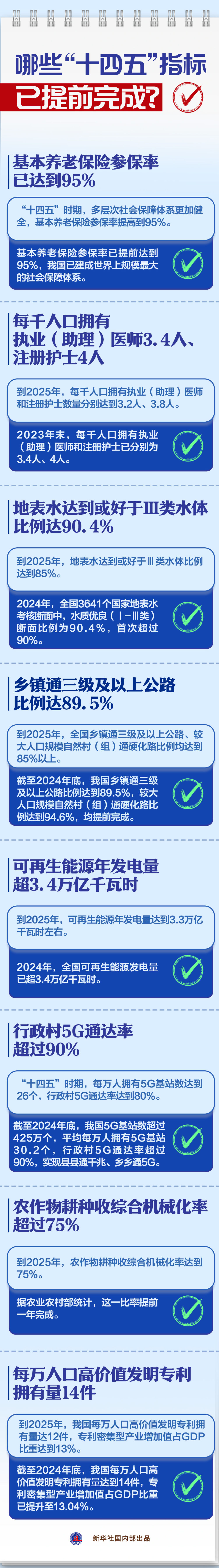 2025年——“十四五”规划的收官之年。今年的政府工作报告提出,高质量完成“十四五”规划目标任务,为实现“十五五”良好开局打牢基础。 截至目前,哪些“十四五”指标提前实现?释放出怎样的信号?一起来听听代表委员怎么说。 基本养老保险参保率已达到95% “十四五”规划纲要提出,“十四五”时期,多层次社会保障体系更加健全,基本养老保险参保率提高到95%。 人力资源社会保障部数据显示,2024年末,我国基本养老保险参保人数约10.73亿人,比上年末增加636万人。基本养老保险参保率已提前达到95%,我国已建成世界上规模最大的社会保障体系。 全面取消外省户籍灵活就业人员在就业地参保限制,积极推动在城镇就业的农民工、新就业形态从业人员、灵活就业人员等群体参加企业职工基本养老保险……“十四五”期间,一系列举措出台,更多人群被纳入覆盖范围,享受社保福利。 全国政协委员、对外经济贸易大学保险学院副院长孙洁说,面对新形势新需要,社会保障网要进一步“扩得开、兜得住、织得密”,建议下一步精准扩大社会保障覆盖面,推动社保提质增效,让社保的阳光温暖每个奋斗者。 每千人口拥有执业(助理)医师3.4人、注册护士4人 根据“十四五”规划纲要、“十四五”卫生健康人才发展规划,到2025年,每千人口拥有执业(助理)医师和注册护士数量分别达到3.2人、3.8人。 国家卫健委数据显示,2023年末,每千人口拥有执业(助理)医师和注册护士已分别为3.4人、4人,快于预期完成。 加强护士薪酬待遇保障,强化相关岗位培训,加快推进“互联网+护理服务”……“十四五”期间,我国医护人员数量不断增加,结构进一步优化,素质和服务水平持续提升。 全国人大代表、甘肃省人民医院副院长韩琳表示,为解决14亿多人的看病问题,国家下了不少力气。建议未来重点加强紧缺急需专业人才的培养和培训,让老百姓在家门口能看病、看好病,更好满足多样化医疗服务需求。 地表水达到或好于Ⅲ类水体比例达90.4% “十四五”规划纲要提出,到2025年,地表水达到或好于Ⅲ类水体比例达到85%。生态环境部数据显示,2024年,全国3641个国家地表水考核断面中,水质优良(Ⅰ-Ⅲ类)断面比例为90.4%,首次超过90%。 “十四五”期间,我国深入推进大江大河和重要湖泊保护治理,组织实施重点排污口整治提升行动,整治城市黑臭水体,创新建立水资源、水环境、水生态“三水统筹”监管机制……多措并举之下,水生态环境质量稳步改善。 全国政协委员、内蒙古自治区生态环境科学研究院正高级工程师路全忠说,要巩固人与自然和谐共生的价值观念,进一步提升公众对生态环保的参与度,让天更蓝、地更绿、水更清,万里河山更加多姿多彩。 乡镇通三级及以上公路比例达89.5% 根据公路“十四五”发展规划,到2025年,全国乡镇通三级及以上公路、较大人口规模自然村(组)通硬化路比例均达到85%以上。 截至2024年底,我国乡镇通三级及以上公路比例达到89.5%,较大人口规模自然村(组)通硬化路比例达到94.6%,均提前完成。 全国政协委员、交通运输部科学研究院副院长兼总工程师王先进表示:“农村地区‘因路而兴’‘因路而富’‘因路而美’,接下来将重点实施新一轮农村公路路网、安全、运输、出行服务、治理能力、和美乡村、助力产业、就业增收‘八大提升行动’,助力乡村全面振兴。” 可再生能源年发电量超3.4万亿千瓦时 根据“十四五”可再生能源发展规划,到2025年,可再生能源年发电量达到3.3万亿千瓦时左右。 最新数据显示,截至2024年底,我国新能源发电装机规模达14.5亿千瓦;2024年,全国可再生能源发电量已超3.4万亿千瓦时。 全国政协委员、国网福建省电力有限公司董事长阮前途表示,在全球气候变暖的背景下,加快发展可再生能源是当务之急,既是推进能源革命的重大举措,也有利于解决我国能源发展面临需求压力大、供给制约较多等挑战。“未来还要在‘绿’字上做大文章,进一步健全绿色低碳发展政策机制,积极稳妥推进能源绿色低碳转型。” 行政村5G通达率超过90% “十四五”信息通信行业发展规划明确,“十四五”时期,每万人拥有5G基站数达到26个,行政村5G通达率达到80%。 截至2024年底,我国5G基站数超过425万个,平均每万人拥有5G基站30.2个,行政村5G通达率超过90%,实现县县通千兆、乡乡通5G。 中国信息通信研究院此前测算,5G商用五年,直接带动经济总产出5.6万亿元,间接带动总产出约14万亿元。 “加快升级新型信息基础设施,优化布局算力基础设施,加快推进‘连算成网’和算力互联互通等将是下一步的重点。”全国政协委员、中国信息通信研究院院长余晓晖说。 农作物耕种收综合机械化率超过75% “十四五”推进农业农村现代化规划提出,到2025年,农作物耕种收综合机械化率达到75%。据农业农村部统计,这一比率提前一年完成。 我国三大主粮基本实现全程机械化,乡村农机从业人员近5000万人,植保无人机保有量超过25万架,大马力农机、适合丘陵山区的农机产品等持续升级…… “原来的老家什已被新工具取代。”全国人大代表、辽宁大连普兰店区杨树房街道战家村党总支书记张德斌说,他所在的战家村基本实现机械化作业,以前靠人工收玉米需要接近一个月,现在使用机械收割只需要5天。 2025年中央一号文件首提“农业新质生产力”,明确加快国产先进适用