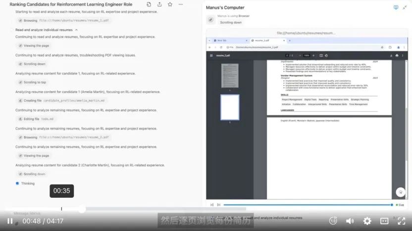 在视频展示的其中一个案例中,Manus可以帮助用户筛选简历。当用户向Manus发送一个包含着10份简历的Zip打包文件时,Manus会像人类一样工作,首先解压文件,然而浏览其中的每一份简历并记录下重要信息,最后梳理出排名建议以及候选人简介、评估标准等附加材料。