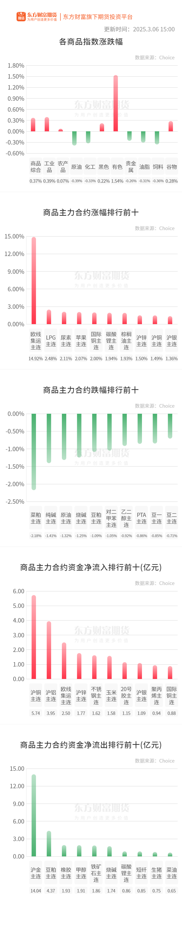 行情纵览![]() 宏观要闻人民财讯:3月6日,国家发改委主任郑栅洁在十四届全国人大三次会议经济主题记者会上表示,提振消费专项行动方案将很快发布实施。 财联社:央行今日进行1045亿元7天期逆回购操作,中标利率为1.50%,与此前持平。 财联社:美国总统特朗普正在考虑减免对加拿大和墨西哥某些农产品征收的关税。当地时间3月5日,美国农业部长布鲁克·罗林斯表示,“一切都在考虑之中”,希望政府能够决定为农业部门提供缓解。罗林斯在白宫表示,至于对农业产业的具体豁免和例外情况,可能包括钾肥和化肥等,还有待确定,“我们相信(特朗普)总统非常关注这些社区”。当天早些时候,美国白宫新闻秘书莱维特表示,美国将对通过美墨加协定进口的汽车给予一个月的关税豁免。 品种资讯黑色系期货 螺纹钢:据不完全统计,3月6日约有6家钢厂调整建材出厂价格,螺纹钢价格最高下调30元/吨。(西本新干线) 截至3月6日当周,螺纹钢产量、表需连续三周增加,厂库连续两周减少,社库连续第十周增加。(Mysteel) 铁矿石:114家钢厂进口烧结粉总库存2896.22万吨,环比上期减12.57万吨。进口烧结粉总日耗111.23万吨,环比上期减0.62万吨。库存消费比26.04,环比上期增0.03。(Mysteel) 农产品期货 生猪:截至3月6日14:00时,全国农产品批发市场猪肉平均价格为20.99元/公斤,比昨天上升0.8%。(农业农村部) 苹果:截至2025年3月5日,全国主产区苹果冷库库存量为549.23万吨,环比上周减少21.81万吨,走货较上周环比减速。 山东产区:本周山东产区库容比为42.57%,较上周减少1.49%。(Mysteel) 有色/贵金属期货 碳酸锂:电池级碳酸锂指数价格74830元/吨,环比上一工作日上涨43元/吨;电池级碳酸锂7.38-7.59万元/吨,均价7.485万元/吨,与上一工作日持平;工业级碳酸锂7.24-7.34万元/吨,均价7.29万元/吨,与上一工作日持平。碳酸锂现货成交价格重心维稳运行。(SMM) 沪铜:3月6日国内市场电解铜现货库37.09万吨,较27日降0.65万吨,较3日降1.66万吨;上海库存23.90万吨,较27日降0.53万吨,较3日降1.20万吨;广东库存6.60万吨,较27日降0.17万吨,较3日降0.34万吨;江苏库存5.66万吨,较27日增0.16万吨,较3日增0.05万吨。(Mysteel) 沪铝:3月6日国内主流消费地电解铝锭库存87.10万吨,环比下降1.5万吨;国内主流消费地铝棒库存30.41万吨,环比周一减少1.01万吨。(SMM) 能化期货 玻璃:截止到3月6日,全国浮法玻璃样本企业总库存环比增加3.59%至6954.8万重箱,刷新去年10月以来新高,同比增幅为17.39%,增幅有所下降。折库存天数31.9天,较上期 0.7天。(隆众资讯) 烧碱:截至20250306,全国20万吨及以上固定液碱样本企业厂库库存44.84万吨(湿吨),环比下滑6.78%,同比下滑5.08%。本周全国液碱样本企业库容比25.05%,环比下滑2.07%;除西北、西南库容比环比上涨外,华北、华东、华中、东北、华南库容比环比呈现下滑。(隆众资讯) 纯碱:截至3月6日,国内纯碱厂家总库存175.99万吨,较周一减少2.29万吨,跌幅1.28%。其中,轻质纯碱85.53万吨,环比增加0.27万吨,重质纯碱90.46万吨,环比减少2.56万吨。较上周四减少5.56万吨,跌幅3.06%。其中,轻质纯碱85.53万吨,环比减少2.10万吨;重质纯碱90.46万吨,环比减少3.46万吨。纯碱综合产能利用率83.29%,环比下跌5.75%。(隆众资讯) 乙二醇:截至3月6日,华东主港地区MEG港口库存总量63.92万吨,较上一周期降低3.2万吨。(隆众资讯) 晚间关注21:15 欧元区:央行利率决议 21:30 美国:当周首次申请失业金人数 (文章来源:东方财富研究中心) |