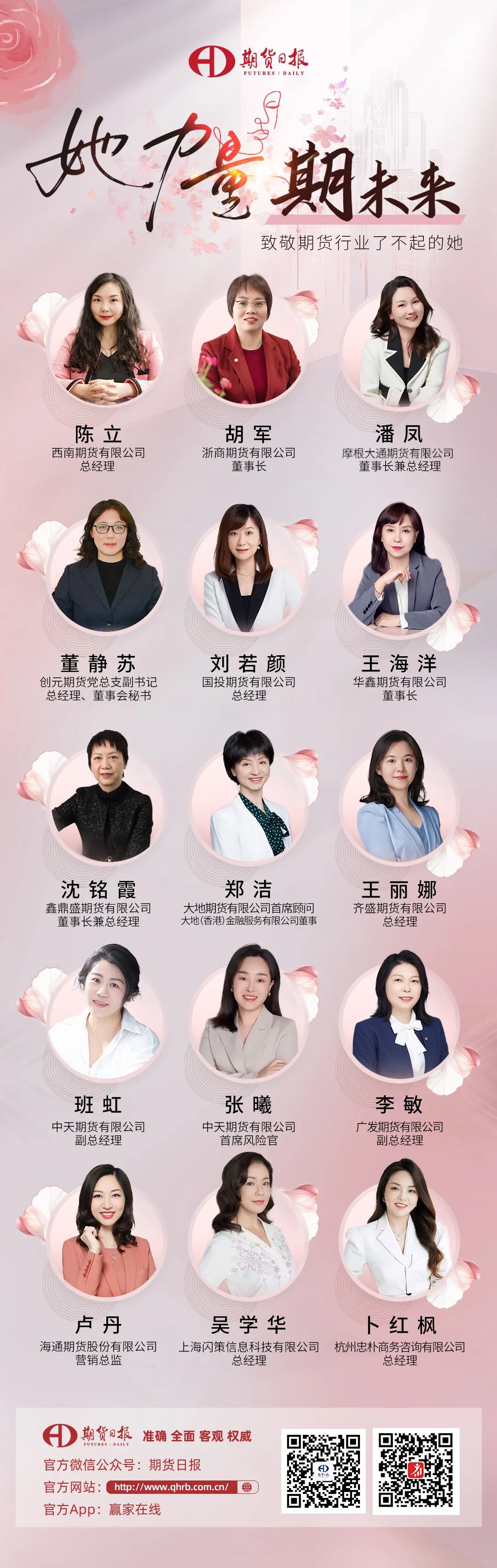 在国际劳动妇女节这个特殊的日子里,我们把目光投向期货行业。这里,有一群女性高管正散发着耀眼的光芒。 她们在充满挑战的期货领域,以非凡的领导力和卓越的职业素养,开辟出属于自己的天地。每一次决策的部署,每一个项目的推进,都凝聚着她们的智慧和坚韧。她们犹如璀璨星辰,照亮了行业的天空。 这些女性高管不仅是个人成就的缔造者,更是“她力量”的生动诠释者。她们的故事激励着更多女性勇敢踏入金融行业,追逐梦想。期货日报聚焦她们的风采,让“她力量”在行业中得到更多关注与认可,推动期货行业朝着多元化蓬勃发展。 3月的春风,拂过大江南北,草长莺飞,杨柳依依。 在全国两会召开的喜庆日子里,属于女同胞的节日就这样“水灵灵”地来了。 女性是多姿多彩的,是“蔓延在草原上随风起舞的韵律”,是“一树一树的花开”,是能“在她周围的人们心里播下温情、希望和雄辩的种子”。 期货行业中的女性,如《小妇人》中所说:“她们有思想、有灵魂,而不仅仅有感情;她们有抱负、有才华,而不仅仅有美貌。” 可记否,市场初创的日子里,那些从八方聚拢在交易大厅中的“风景”,用微笑和红色传递着行业的生机和青春;清理整顿那段特别的时期,那些“咬定青山不放松”的执着力量,把青涩淬炼成锋芒,终于“守得云开见月明”;规范创新的峥嵘岁月中,那些出现在市场各个角落的纤细身影,犹如春潮在期货土壤里犁出的诗行,感染着行业内外的你我他;高质量发展的新时代里,那些基层耕耘者和机构领航人,凝练出夺目的生命光谱,“聚是一团火,散作满天星”…… 可以说,在期货市场三十多年瑰丽璀璨的发展历程当中,无数女性不仅用芳华诗化了市场,还用温情、希望和勇毅美丽了发展。 她们以独特的视角洞察市场的脉搏跳动,以细腻的观察捕捉市场的情绪变化,以敏锐的直觉感知价格的波动节奏,以笃定的坚守描绘职业的锦绣画卷。 她们有着无比的柔韧和耐心,把稳定和细致卓越成了风格,在K线跳动和市场波动中保持着克制和沉着,为市场平稳运行注入了强大的正能量。 她们有着特别的细心和共情,把倾听和理解固定成了日常,在团队协作和业务开拓中释放着价值和能量,为行业有机顺滑运转奉献出珍贵的协同力。 她们有着非凡的专业和严谨,把突破和进取炼成了底色,在变幻莫测的表象和混沌中找出真相和真实,为企业抵御风险提供了及时的加速度。 她们有着特殊的眼界和智慧,把统筹和开拓内化为了魅力,在团队管理与建设中盘活和激发出澎湃动能,为行业高质量发展增添多元包容的大气象。 让我们致敬女同胞那永不设限的星辰大海和温柔航程! 愿你们以感性为帆、以理性作舟,在服务实体经济发展轨道上创造更多的奇迹; 愿你们以风险为墨、以盈亏作砚,在新时代风险管理卷轴上描绘出更绚的传奇; 愿你们以星光为线、以春风作针,在国家软实力提升征途上织就出更美的华彩。 让我们以“‘她’力量 ‘期’未来”为祝酒词,以报、网、端为祝酒杯,敬你们眼中有星辰、胸中有沟壑、手中有鲜花的模样,祝你们“我笑,便面如春花”! 节日快乐! ——写在国际劳动妇女节到来之际