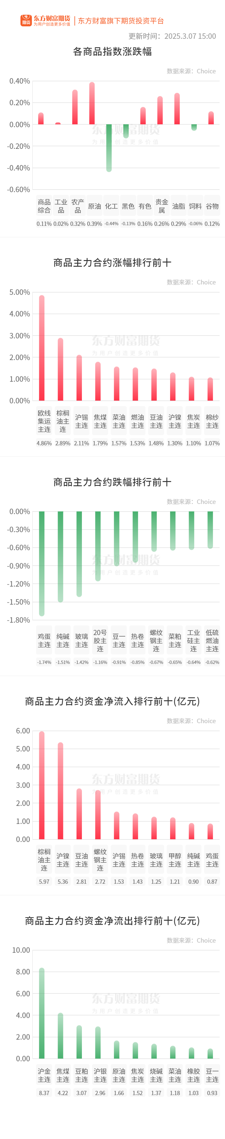 行情纵览![]() 宏观要闻海关总署:据海关统计,2025年前两个月,我国货物贸易进出口总值6.54万亿元人民币,同比下降1.2%(与去年同期相比,今年前两个月少了2个工作日,剔除不可比因素影响,进出口增长1.7%)。其中,出口3.88万亿元,增长3.4%;进口2.66万亿元,下降7.3%。按美元计价,前两个月,我国进出口总值9093.7亿美元,下降2.4%。其中,出口5399.4亿美元,增长2.3%;进口3694.3亿美元,下降8.4%。 财联社:央行今日进行1850亿元7天期逆回购操作,中标利率为1.50%,与此前持平。 品种资讯黑色系期货 铁矿石:3月7日全国47个港口进口铁矿库存为15087.88,环比降668.52;日均疏港量317.08增2.55。分量方面,澳矿6268.61降407.80,巴西矿6149.40降125.50;贸易矿9929.28降393.89,粗粉11708.01降528.55;块矿1867.28降89.21,精粉1064.96降48.80,球团447.63降1.96,在港船舶数72条增15条。(单位:万吨) 全国45个港口进口铁矿石库存总量14577.88万吨,环比降643.52万吨,45港日均疏港量303.65万吨,环比增4.82万吨。 全国钢厂进口铁矿石库存总量为9182.41万吨,环比增15.22万吨;当前样本钢厂的进口矿日耗为 286.01万吨,环比增1.84万吨,库存消费比32.11天,环比减0.15天 。(Mysteel) 焦煤:本周全国16个港口进口焦煤库存为728.89减59.95;其中华北3港焦煤库存为341.59减32.05,东北2港39.30减9.90,华东9港189.00减6.00,华南2港159.00减12.00。本周Mysteel统计全国18个港口焦炭库存为239.68增8.13;其中北方5港焦炭库存为71.75增1.85,华东10港146.93增6.28,南方3港21.00持平0.00。(单位:万吨)(Mysteel) 钢材:Mysteel调研247家钢厂高炉开工率79.51%,环比上周增加1.22个百分点,同比去年增加3.91个百分点 ;高炉炼铁产能利用率86.54%,环比上周增加0.96个百分点 ,同比去年增加3.43个百分点;钢厂盈利率53.25%,环比上周增加3.03个百分点,同比去年增加29.01个百分点;日均铁水产量 230.51万吨,环比上周增加2.57万吨。(Mysteel) 农产品期货 生猪:截至3月7日14:00时,全国农产品批发市场猪肉平均价格为20.81元/公斤,比昨天下降0.9%。(农业农村部) 大豆:今日中储粮组织51835吨进口大豆原油(2023年份)双向购销竞拍,全部成交,标的交收地为中央储备粮镇江新区直属库有限公司镇江油库、中央储备粮杭州直属库有限公司、中央储备粮湖州直属库有限公司、中储粮(日照)储备有限公司、中储粮(合肥)储备有限公司。 其中,除湖州直属库采购为8300元/吨,销售价为8410元/吨之外,镇江油库、杭州直属库、中储粮(日照)储备、中储粮(合肥)储备采购价均为8300元/吨,销售价均为8300元/吨。现货价格,镇江一豆现货报价8480(05+510)元/吨,湖州一豆现货报价8630(05+660)元/吨,日照一豆现货报价8390(05+420)元/吨。(Mysteel) 棕榈油:据马来西亚棕榈油协会(MPOA)发布的数据,马来西亚2月1-28日棕榈油产量预估减少10.30%,其中马来半岛减少9.78%,沙巴减少12.75%,沙捞越减少5.48%,马来东部减少10.85%。 南部半岛棕榈油压榨商协会(SPPOMA)数据显示,2025年3月1-5日马来西亚棕榈油单产增加9.79%,出油率增加0.21%,产量环比增加10.90%。(新华财经) 有色/贵金属期货 工业硅:3月7日,华东不通氧553#在10500-10600元/吨;通氧553#在10600-10700元/吨;521#在10900-11200元/ 吨;441#在10900-11200元/吨;421#在11300~11500元/吨; 421#有机硅用在11900-12300元/吨;3303#在11800-12000元/吨。黄埔港、天津、西北、新疆、四川、上海地区硅价持稳,昆明个别硅价小幅走弱。再生硅和97硅价格持稳。(SMM) 多晶硅:截至3月7日,本周多晶硅(致密料)市场均价36.5元/千克,即期制造成本约43.0元/千克,即期单公斤净利约为-6.5元/千克。价格方面,本周多晶硅致密料价格持稳。成本方面本周工业硅价格持稳,成本暂无变化。本周多晶硅环节净利润环比持平。(Mysteel) 碳酸锂:电池级碳酸锂指数价格75029元/吨,环比上一工作日上涨199元/吨;电池级碳酸锂7.41-7.6万元/吨,均价7.505万元/吨,环比上一工作日上涨200元/吨;工业级碳酸锂7.26-7.36万元/吨,均价7.31万元/吨,环比上一工作日上涨200元/吨。(SMM) 能化期货 PVC:截至3月6日PVC社会库存环比减少0.02%至86.52万吨,同比增加0.23%;其中华东地区在80.17万吨,环比减少0.39%,同比增加0.56%;华南地区在6.35万吨,环比增加04.78%,同比减少3.79%下周期中国PVC社会仓库库存量预计在86万吨左右,市场需求继续回升,终端采购需求预期增加,市场库存预期消化降低。(隆众资讯) 烧碱:本周烧碱样本企业产能平均利用率为85.6%,较上周环比+1.7%。周内华北、华东、华南均有氯碱设备检修结束提负,其中华南提负较为明显,具体来看,华南+14.3%,华北+1.8%,华东+1.4%,山东产能利用率+2.6%至91.5%。本周,山东氯碱企业周平均毛利在341元/吨,较上周持平。预估下周液碱价格上调,液氯价格稳中偏弱,预计山东氯碱利润上调。(隆众资讯) 晚间关注18:00 欧盟:非季调GDP当季同比 21:30 美国:季调后新增非农就业人数;美国:季调后失业率 (文章来源:东方财富研究中心) |