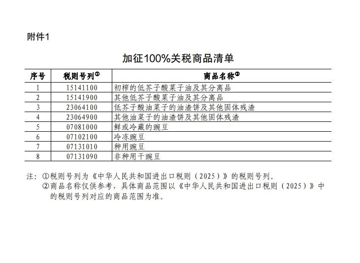 中国出手了! 国务院关税税则委员会:3月20日起,对原产于加拿大的部分进口商品加征关税 国务院关税税则委员会办公室发布公告称,加拿大政府宣布,自2024年10月1日起,对中国电动汽车加征100%关税;自2024年10月22日起,对中国钢铁和铝产品加征25%关税。加方单边加征关税的做法罔顾客观事实和世界贸易组织规则,是典型的贸易保护主义做法,构成对中方的歧视性措施,严重侵害中方的合法权益,破坏中加经贸关系。 根据《中华人民共和国关税法》、《中华人民共和国海关法》、《中华人民共和国对外贸易法》等法律法规和国际法基本原则,经国务院批准,国务院关税税则委员会发布公告,自2025年3月20日起,对原产于加拿大的菜子油、油渣饼、豌豆加征100%关税;对原产于加拿大的水产品、猪肉加征25%关税。中方敦促加方理性看待双边经贸合作,尊重客观事实,遵守世界贸易组织规则,立即纠正错误做法。