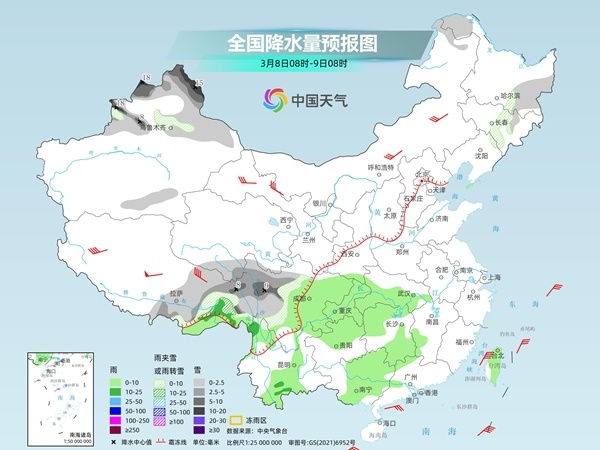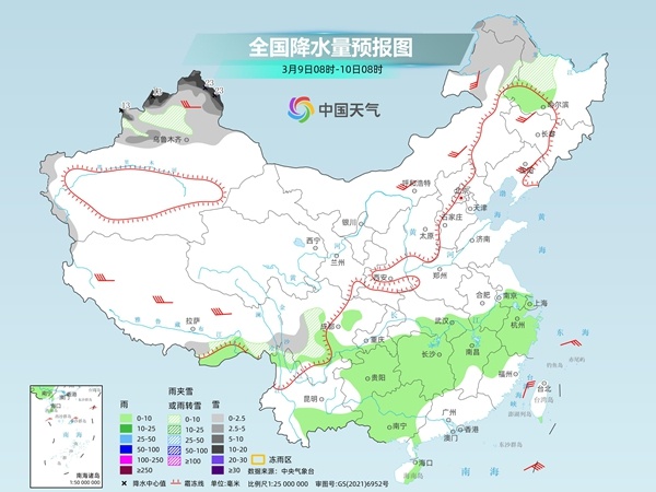 预计这个周末(3月8日至9日),阴雨频繁是南方大部地区的天气“主旋律”,降雨还将再度向东扩展,覆盖江南、华南北部等地。受降雨打压,南方大部气温回升乏力,而北方回温势头正盛,周日南北方多地或出现气温倒挂的情况。 未来三天南方阴雨持续在线 江南华南对流特征显著 昨天,南方大部依然阴雨在线,江南、华南、西南地区东部等地多小到中雨或阵雨。 预计未来三天,南方仍会维持阴雨频繁的天气格局,其中9日至10日,随着暖湿气流增强,南方的降雨还将再度向东扩展。 具体来看,中央气象台预计今天,新疆北部、西藏南部和东部、青海南部、川西高原、东北地区东部等地部分地区有小到中雪或雨夹雪,其中,新疆阿勒泰山区和塔城及天山西段高海拔山区、西藏东北部、川西高原中部等地部分地区有大到暴雪。西藏东南部、西南地区东部和南部、江汉西部、江南西部、华南北部和西部、台湾岛等地部分地区有小到中雨。