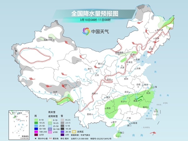 后天,内蒙古东北部、黑龙江北部、新疆北部和沿天山地区以及南疆西部山区、西藏中东部、川西高原西北部、青海南部、甘肃北部、河北北部等地部分地区有小到中雪或雨夹雪,其中,新疆南疆西部山区局地有大雪。黑龙江东北部、西藏南部、西南地区东南部、江南大部、华南西北部、海南岛等地部分地区有小到中雨。