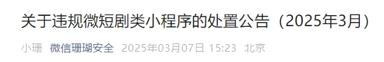 3月7日,“微信珊瑚安全”公众号发布关于违规微短剧类小程序的处置公告(2025年3月)。内容如下: