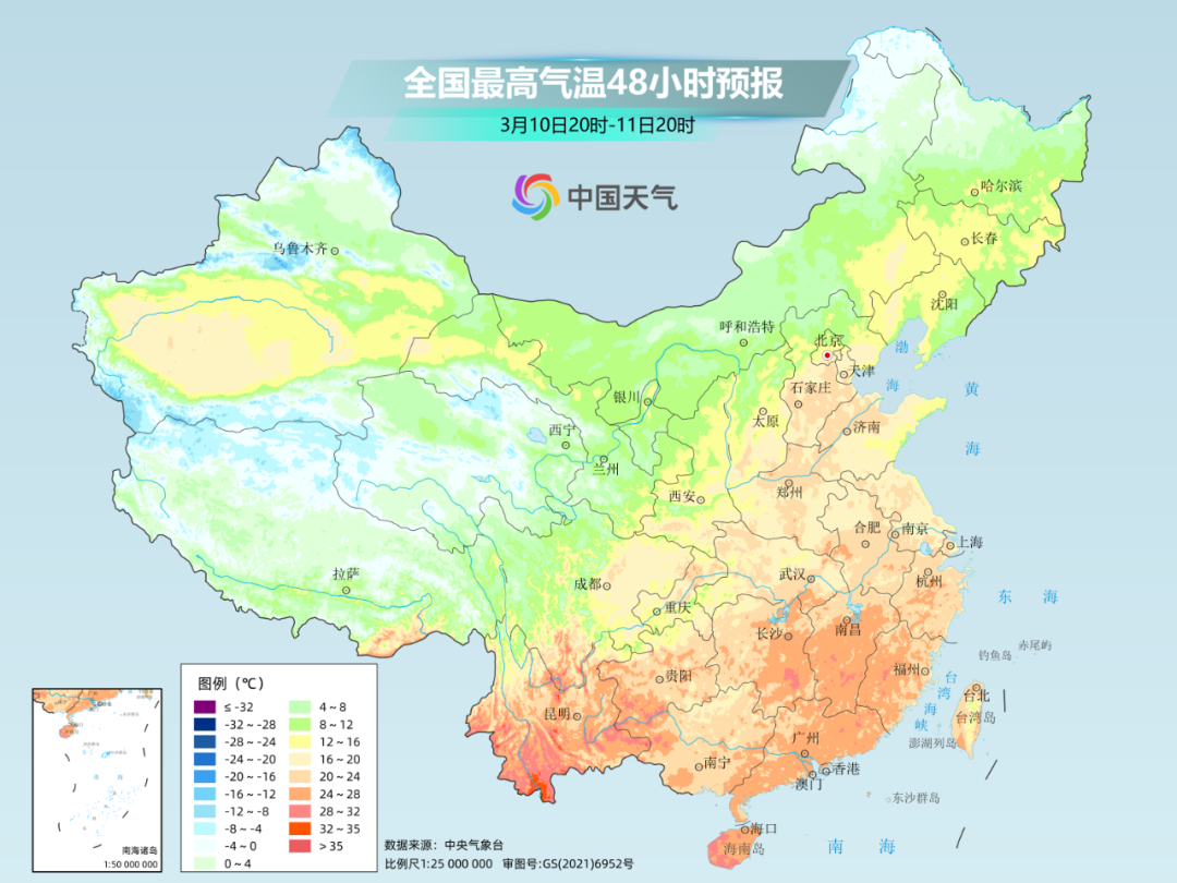 南方也将开启升温模式,并在11日至12日达到气温高点,西南地区东部到江南等地最高气温将升至20°C以上,最高气温20℃线将向北推进到河北南部,回暖之强势,可见一斑。 ▶ 后冷 随着冷空气接连登场,大回暖将戛然而止。下周将有两股冷空气影响我国,中东部地区累积降温幅度将普遍达到8~12℃,到下周后段,气温将自北向南再次转为偏低。 10-12日,新疆及中东部大部自西向东有一次冷空气过程,大部地区有4~6℃降温,新疆、内蒙古及东北地区南部降温幅度有8~10℃,黄淮及其以北地区有4~6级偏北风,阵风7~8级,内蒙古中部局地风力可达10级左右。