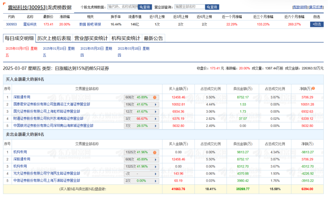 近期,科技板块在资本市场的热度居高不下。 消息面上,2025年政府工作报告明确提出:建立未来产业投入增长机制,培育生物制造、量子科技、具身智能、6G等未来产业。同时,全球第一款通用AI智能体Manus的发布也点燃了资本市场的热情。 券商中国记者梳理近期龙虎榜数据发现,人形机器人、AI智能体、6G等热门概念股股价大幅波动背后,有不少机构及北向资金的身影。 北向资金、机构博弈人形机器人热门股 今年具身智能首次被写入政府工作报告,让A股人形机器人相关概念股的人气升温。 券商中国记者注意到,3月7日(周五)盘后龙虎榜显示,震裕科技、美力科技等人形机器人概念股上榜,并且有不少机构席位以及北向资金上榜。值得一提的是,震裕科技今年以来涨幅高达149%,美力科技今年以来上涨136.5%,其中美力科技仅3月份以来涨幅就高达53.6%。 具体来看,震裕科技是国内精密冲压模具领域的领先企业,公司投资全资子公司马丁机器人,主要专注在人形机器人领域所需精密零件。公司今年3月3日接受机构调研时称:“公司机器人组件及精密零部件产品都处于投入期,近期虽已实现小批量交付但营收规模相对较小,预计对公司业绩贡献度很小。” 截至3月7日收盘,震裕科技报收于173.41元/股,上涨20%。震裕科技3月7日龙虎榜显示,机构合计净卖出1.81亿元,北向资金合计净买入3706.29万元。从买入席位来看,除了北向资金以外,国泰君安证券股份有限公司宜昌沿江大道证券营业部当日净买入1亿元。