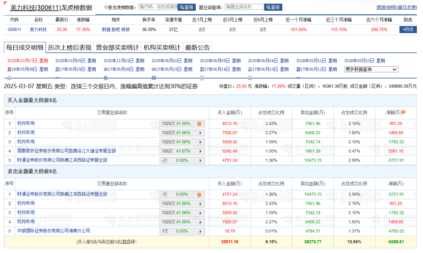 此外,美力科技近期也因人形机器人概念受到资金关注。美力科技3月7日公告称,公司股票于3月5日至3月7日连续三个交易日收盘价格涨幅偏离值累计超过30%,属于股票交易异常波动的情况。公司应用于人形机器人的弹簧处于小批量交样阶段,短期内对公司业绩无重大影响。敬请广大投资者理性决策,审慎投资,注意投资风险。 美力科技3月7日龙虎榜显示,近3个交易日,机构剧烈博弈,买入及卖出前五席位各出现三个机构席位。三机构合计买入2.20亿元,三机构合计卖出2.14亿元,机构整体呈现小额净买入。