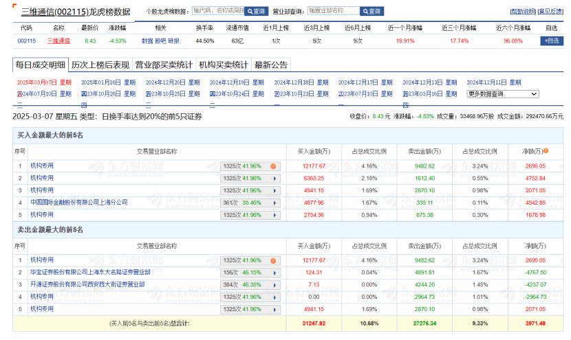 6G热门概念股被机构狂买 值得一提的是,6G在今年政府工作报告首次出现,也让三维通信等概念股大涨。 三维通信是无线通信解决方案提供商,3月份以来涨幅达15.32%。 3月7日,三维通信下跌4.53%,日换手率达44.50%,收盘价8.43元/股。当日,交易所公布的交易公开信息显示,三维通信因换手率达20%的证券登上龙虎榜。 龙虎榜数据显示,3月7日,龙虎榜前五个席位总买入额3.12亿元,总卖出额2.73亿元。 三维通信当日龙虎榜几乎被机构“承包”。具体来看,买入前五席位中机构占据四席,卖出前五席位中机构占了三席,整体来看,机构合计净买入8433.2万元。另外,中国国际金融股份有限公司上海分公司当日净买入逾4500万元。