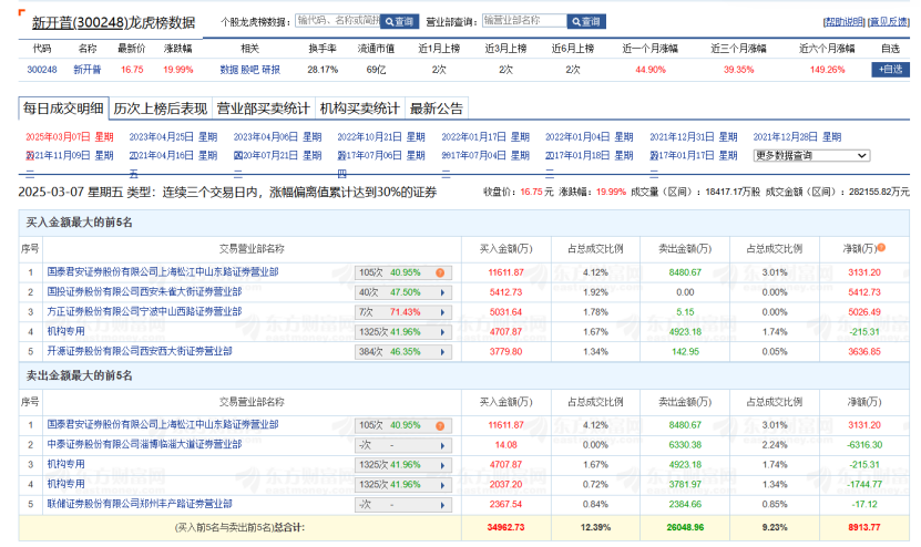 酷特智能获机构大额买入 当前,市场另一大热点是AI智能体。3月6日凌晨,国产大模型团队Monica推出的Manus在网络上引发了广泛关注,随后点燃了A股市场AI智能体资金热情。 值得一提的是,2025年全国两会期间AI智能体也受到了代表的关注。全国人大代表、东方财富董事长其实表示,随着大模型应用的纵深推进,AI Agent(智能体)正逐渐成为技术演进的新趋势和大模型应用的主流范式。为了更好地释放AI Agent赋能千行百业的巨大潜力,其实建议加快推动大模型应用创新:一是加快推动模型落地服务商的培育;二是加快推进多元场景与数据的开放;三是加快推进关键行业、重点环节的标准供给。 近期,新开普、酷特智能等AI智能体相关概念股因涨幅较大登上龙虎榜。 新开普是国内高校信息化龙头公司,据悉新开普推出的智慧校园智能体服务AI产品“小美同学”,实现校园服务助手落地。3月份以来,新开普股价已经大涨50.9%。 新开普3月7日龙虎榜显示,3月5日至3月7日三个交易日内,买入前五中有1个机构席位、卖出前五中有2个机构席位,机构合计净卖出1960.07万元。国泰君安上海松江中山东路证券营业部、国投证券西安朱雀大街证券营业部等营业部榜上有名。