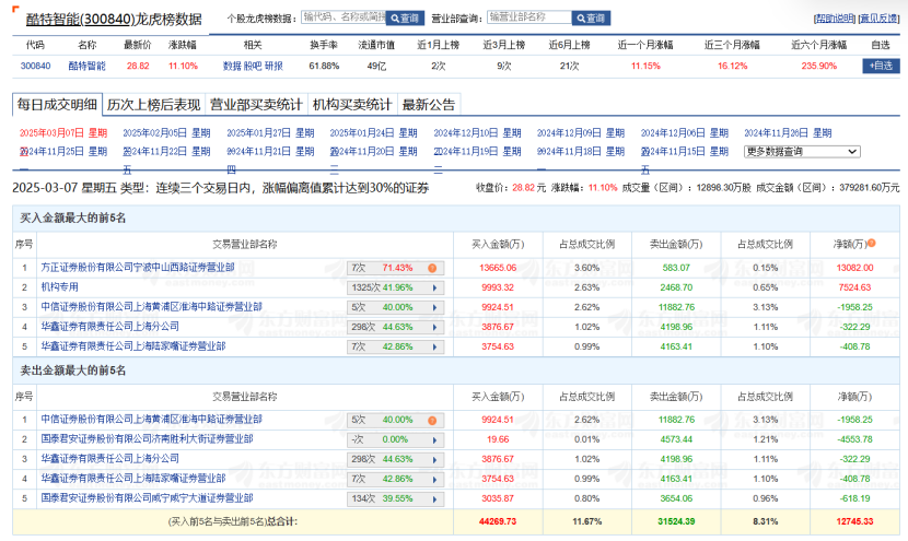 酷特智能主要从事个性化定制服装的生产与销售,近期因AI智能体概念而走热。酷特智能在3月7日上涨11.10%,成交额31.95亿元,换手率高达61.88%,盘后龙虎榜数据显示,当日二机构专用席位净买入8857.22万元。 与此同时,酷特智能还因连续三个交易日内,涨幅偏离值累计达到30%的证券,披露了近三日的数据。3月5日至3月7日,方正证券股份有限公司宁波中山西路证券营业部净买入1.31亿元,机构专用席位净买入超7500万元。此外,卖出金额靠前的营业部则包括中信证券股份有限公司上海黄浦区淮海中路证券营业部、国泰君安证券股份有限公司济南胜利大街证券营业部、华鑫证券有限责任公司上海分公司等。