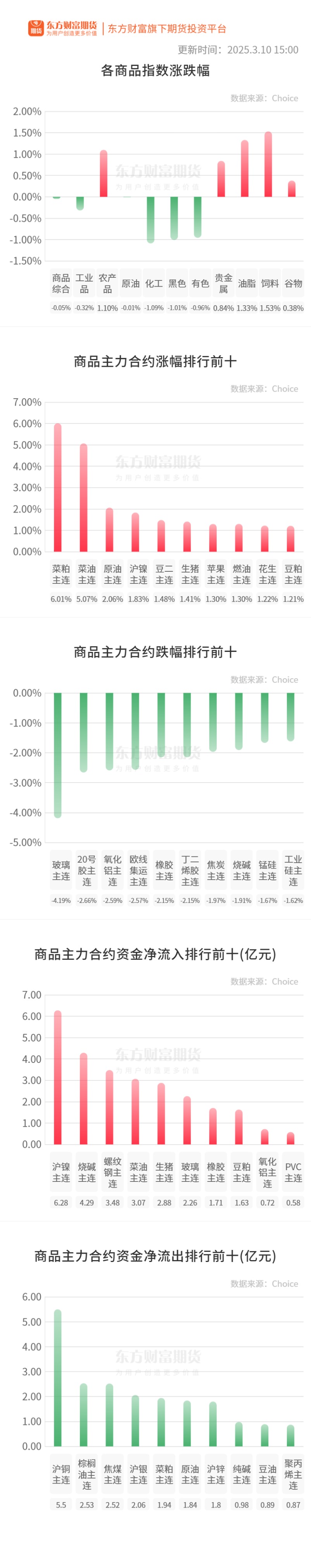 行情纵览![]() 宏观产经财联社:当地时间周日晚间,在自由党党代会上,现年已经91岁高龄的加拿大前总理让·克雷蒂安(Jean Chretien)上台表示,在美加贸易战中,加拿大完全有权像美国那样进行强硬地采取报复措施。他认为,加拿大应该通过对主要出口产品(如石油、天然气、电力、钾肥和铝等)征出口税,从而对美国进行更猛烈、更精准的反击。 央视新闻:全国政协十四届三次会议自3月4日开幕以来,来自34个界别的2000多名政协委员深入协商议政、广泛凝聚共识;截至3月5日20时,共收到提案5890件。依据《中国人民政治协商会议全国委员会提案工作条例》和提案审查工作细则,经审查,立案5002件,并案262件,转为意见和建议626件。 品种资讯黑色系期货 钢材:美商务部长称3月12日起对进口钢铝征收25%关税;1-2月全国挖掘机销售31782台,同比增长27.2%;近日龙腾新能3800mm中厚板项目一次性热试成功。 商家反馈下游终端采购意愿不强,投机需求几无,钢材需求整体表现不佳。同时,黑色期货下跌,加重市场观望情绪,短期钢价或弱势窄幅调整。(我的钢铁网) 铁矿石:2025年03月03日—03月09日Mysteel澳洲巴西铁矿发运总量2642.5万吨,环比减少95.1万吨。澳洲发运量1826.2万吨,环比减少115.1万吨,其中澳洲发往中国的量1487.4万吨,环比减少80.9万吨。巴西发运量816.3万吨,环比增加20.1万吨。(我的钢铁网) 农产品期货 菜粕:3月8日国务院关税税则委员会公告,自2025年3月20日起,对原产于加拿大的菜子油、油渣饼、豌豆加征100%关税;对原产于加拿大的水产品、猪肉加征25%关税。消息一出,菜粕供应收紧预期迅速升温。(新华财经) 棕榈油:马来西亚棕榈油局MPOB数据显示,马来西亚2月棕榈油出口为1002135吨,环比减少16.27%。(财联社) 豆粕:一是3月份我国进口大豆到港减少,油厂大豆及豆粕库存将逐步下降,支撑豆粕价格。二是菜粕等蛋白粕价格偏强运行,比价优势下,国内豆粕价格将得到提振。预计3月下旬国内豆粕价格偏强运行,4月下旬随着进口大豆到港增多,豆粕库存将回升,届时价格可能转弱。(国家粮油信息中心) 有色/贵金属期货 沪铜:截至3月10日周一,SMM全国主流地区铜库存对比上周四下降0.8万吨至36万吨,总库存较节前的16.58万吨增加19.42万吨,其中上海较节前高13.05万吨,广东地区高3.41万吨,江苏地区高3.29万吨。此外,值得关注的是,目前国内铜库存已经低于去年同期,库存拐点已经显现。(SMM) 碳酸锂:电池级碳酸锂指数价格75009元/吨,环比上一工作日下跌20元/吨;电池级碳酸锂7.41-7.6万元/吨,均价7.505万元/吨,与上一工作日持平;工业级碳酸锂7.26-7.36万元/吨,均价7.31万元/吨,与上一工作日持平。碳酸锂现货成交价格重心维稳运行。(SMM) 能化期货 烧碱:今日部分走货好转,库存低位企业价格继续拉涨。近期关注重点依然在主力下游送货量及库存的变化上。鲁西南32%离子膜碱主流成交涨至1000-1030;鲁中东部32%离子膜碱主流成交960-1020,50%离子膜碱主流成交1580-1680;鲁北地区32%离子膜碱主流成交993-1050;鲁南32%离子膜碱主流成交涨至980-1000。(单位:元/吨)(隆众资讯) 尿素:山东地区尿素行情小幅上涨,小颗粒主流出厂成交1780-1810元/吨,大颗粒出厂报价2200-2230元/吨。临沂市场一手贸易商出货参考价格1820-1830元/吨附近,菏泽市场参考价格1810-1820元/吨附近。华鲁装置短时检修,省内其它企业生产基本正常。周末期间省内企业低端成交好转,近两日价格上调10-20元/吨。(隆众资讯) 苯乙烯:截至3月10日,江苏苯乙烯港口样本库存总量18.6万吨,较上周期减少0.81万吨,幅度-4.17%。商品量库存在12.4万吨,较上周期减少0.56万吨,幅度-4.32%。当前消息看抵港补充暂在3万吨附近,抵港一般,而下游需求预期维持稳定,若无进一步的抵港增量变化,则预期港口库存有小幅下降。(隆众资讯) 晚间关注无 (文章来源:东方财富研究中心) |