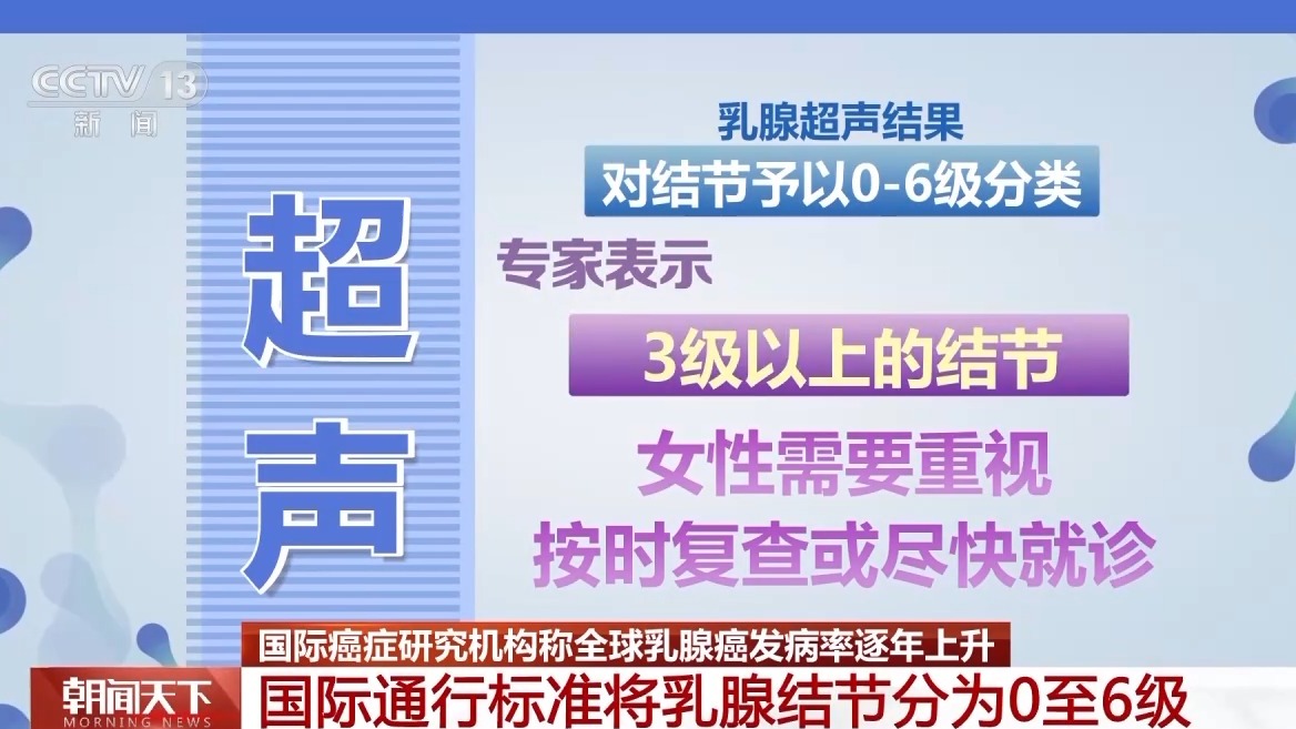 根据国际通行的BI-RADS分级标准,对结节予以0至6级分类。专家表示,3级以上的结节,女性需要重视,按时复查或尽快就诊。