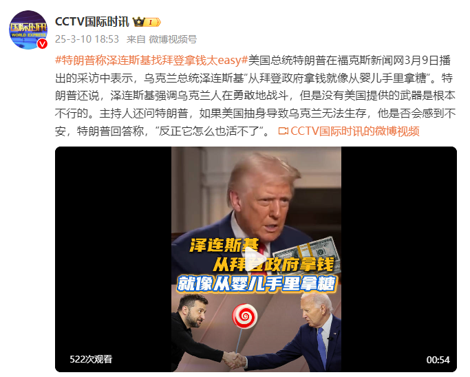 美国总统特朗普在福克斯新闻网3月9日播出的采访中表示,乌克兰总统泽连斯基“从拜登政府拿钱就像从婴儿手里拿糖”。特朗普还说,泽连斯基强调乌克兰人在勇敢地战斗,但是没有美国提供的武器是根本不行的。主持人还问特朗普,如果美国抽身导致乌克兰无法生存,他是否会感到不安,特朗普回答称,“反正它怎么也活不了”。
