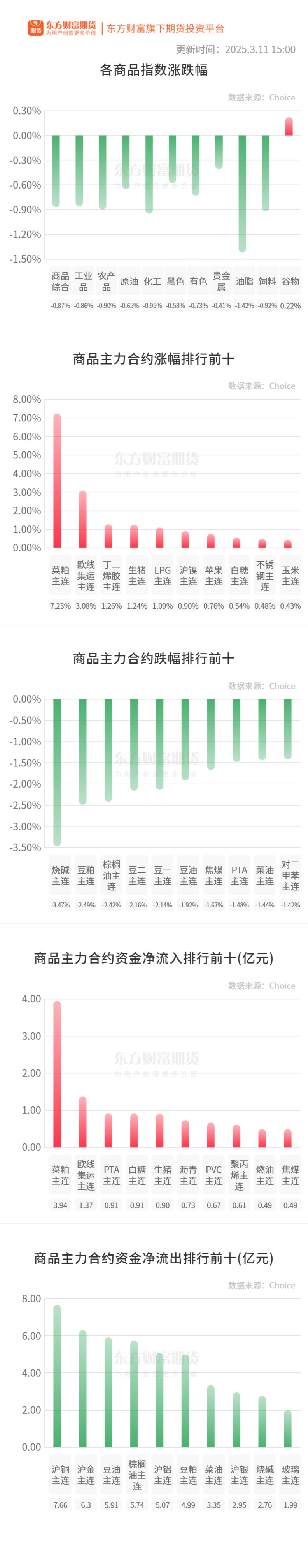 行情纵览![]() 宏观产经央视新闻:中国汽车工业协会11日公布的数据显示,今年1至2月份,我国汽车产销量继续保持稳定增长,其中新能源汽车产销量及出口量市场表现突出。1至2月份,我国汽车产销分别完成455.3万辆和455.2万辆,同比分别增长16.2%和13.1%。 人民财讯:中国驻美国大使谢锋说,面对经济全球化遭遇逆风和回头浪,中国始终坚持对外开放不动摇,持续扩大制度型开放、自主开放和单边开放。中国已成为150多个国家和地区的主要贸易伙伴,去年新设立外商投资企业增长9.9%,今年1月英国、韩国、荷兰对华投资增长324%、104%、76%,“外资撤离中国论”宣告破产,“中国大市场是必选项”深入人心。 财联社:央行今日进行377亿元7天期逆回购操作,中标利率为1.50%,与此前持平。 品种资讯黑色系期货 钢材:截至3月11日,唐山地区钢坯市场呈现库存与价格同步承压态势。主流仓储钢坯库存量攀升至111.69万吨,周环比增加4.47万吨,但较去年同期仍减少10.05万吨。值得关注的是,当前日均累库速度达1.28万吨,持续攀升的库存压力与价格走势形成共振:钢坯出厂价格周环比下调30元/吨,较去年同期下调410元/吨。 今日黑色期货弱势震荡,市场交投氛围清淡,贸易商多数降价出货为主,节后以来需求复苏偏慢。同时,近日原燃料价格走弱,焦炭第十一轮提降风险增高,成本对钢价支撑减弱。不过,随着天气进一步转暖,预期3月开工季需求还会回暖。短期钢价或弱势窄幅调整,深跌可能性不大。(我的钢铁网) 动力煤:据Mysteel,3月份是传统用煤淡季,煤炭供需宽松依旧,终端大规模采购的动力依旧不足。截至2025年3月7日,55个港口样本动力煤库存环比增142.5万吨至7305.4万吨,创3个月高位。其中,环渤海区域港口库存3262万吨,创阶段新高,环比增幅超7%,较去年同期高逾4成,华东港存亦环比增加,而东北、江内及华南区域港口库存环比下降,同比则仍维持增势。(我的钢铁网) 农产品期货 生猪:据农业农村部监测,3月11日“农产品批发价格200指数”为119.16,比昨天下降0.15个点,“菜篮子”产品批发价格指数为120.25,比昨天下降0.18个点。截至今日14:00时,全国农产品批发市场猪肉平均价格为20.73元/公斤,比昨天下降0.4%;鸡蛋8.45元/公斤,比昨天下降1.1%。(农业农村部) 苹果:2025年3月11日,苹果产区行情变动不大,市场客商小单车继续采购低价货源,低价货源受货源减少影响,仍有稳硬表现。好货交易不多,果农以及持货商观望,客商压价,价格稍显僵持。目前陕西、辽宁走货尚可,山东走货稍显缓慢。(中果网) 豆粕:由于进口大豆到港减少,而油厂开机率维持较高水平,上周国内大豆、豆粕商业库存均下降。监测显示,3月7日,全国主要油厂进口大豆库存407万吨,周环比下降49万吨,月环比下降216万吨,同比回升22万吨,较过去三年均值回升81万吨。主要油厂豆粕库存60万吨,周环比下降4万吨,月环比回升17万吨,同比回升11万吨。(国家粮油信息中心) 有色/贵金属期货 氧化铝:据Mysteel调研了解,西南某大型氧化铝厂计划4月初进行设备检修,涉及产能约480万吨/年,检修周期10天左右,初步预估影响产量在10万吨以上,具体情况将持续跟踪。(我的钢铁网) 碳酸锂:今日工业级碳酸锂在7.20-7.46万元/吨,电池级碳酸锂在7.48-7.60万元/吨。今日碳酸锂现货价格暂稳,市场弱势心态占据主流,基本面缺乏足够的利好驱动。(隆众资讯) 沪铜:中信证券研报指出,近期美国进口铜关税预期不断升级,COMEX铜价以及较LME价差创阶段新高。关税预期强化或导致美国短期缺口难解,COMEX交易的持续性和幅度料将不断得到验证。美国加征关税对我国需求的抑制或有限,反而可能会制约我国精炼铜和废铜进口。叠加政策暖风频吹,交易面和基本面加速共振,铜价有望冲击前高。全面推荐铜板块投资价值。(财联社) 能化期货 原油:据彭博社10日报道,美国能源部长克里斯·怀特(Chris Wright)当日在剑桥能源周上接受采访时表示,特朗普政府已经准备好对伊朗石油生产实施制裁。(新华财经) 烧碱:今日,山东液碱市场大面维稳观望,各厂成交情况表现不同。近期关注重点依然在主力下游送货量及库存的变化上。鲁西南32%离子膜碱主流成交1000-1030;鲁中东部32%离子膜碱主流成交960-1020,50%离子膜碱主流成交1580-1680;鲁北地区32%离子膜碱主流成交993-1050;鲁南32%离子膜碱主流成交980-1000。(单位:元/吨)(隆众资讯) 晚间关注无 (文章来源:东方财富研究中心) |