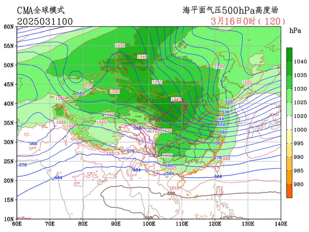 海平面气压500百帕高度场图,图中绿色为冷高压。 16日前后气温将降至本次过程的低点,最高气温15℃线退至江南南部,华北南部到长江沿线最高气温降至10℃上下。 2大风、沙尘 冷空气制造降温的同时,也带来了大风。今明天,内蒙古、河北、黑龙江、吉林、辽宁等地将有5至6级风,明天内蒙古东南部阵风风力或有一定极端性。 在大风推动下,沙尘天气也向东向南推进,中央气象台今天晚上发布了沙尘暴蓝色预警,预计今天夜间到明天,新疆南部、内蒙古中部和东南部、甘肃东部、陕西中北部、山西、河北、北京、天津、河南中北部、山东、辽宁中西部、吉林西部等地有扬沙或浮尘天气,其中内蒙古中部局地有沙尘暴。