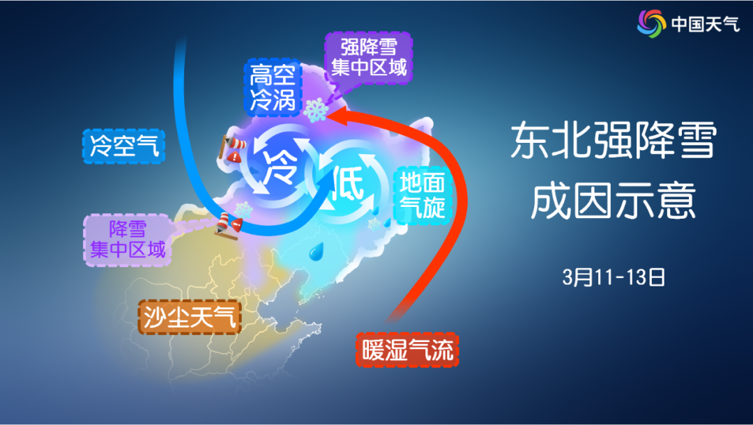 从历史数据统计来看,春季为我国沙尘天气高发期,约80%的沙尘过程都出现在3月至5月。沙尘天气下,大家尽量减少户外活动,出门做好防范。 3暴雪 冷空气东移过程中,地面气旋系统东移并发展加强,冷涡后部冷空气与高空槽前西南暖湿气流辐合,将给内蒙古东北部、东北一带带去较大范围的雨雪天气,今明天将是降雪的鼎盛时段。