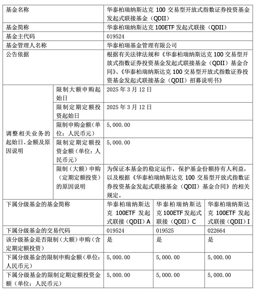 近期,随着美股持续调整,部分合格境内机构投资者(QDII)基金放开限购门槛。与此同时,跨境ETF溢价率显著收窄,多数产品降至5%以下甚至折价。 对于美股后市,业内人士认为,短期美股已调整到了有一定吸引力的水平,但“抄底”时机或仍不成熟。 美股持续调整,QDII基金接连调整限购政策 近期,随着美股市场显著回调,部分资金从美股主题基金撤离。由于外汇额度和高溢价风险释放,部分基金公司开始调整限购政策。 3月12日,华泰柏瑞基金公告称,为保证基金稳定运作,保护基金份额持有人利益,自2025年3月12日起,华泰柏瑞纳斯达克100ETF联接基金(QDII)大额申购(含定期定额投资)业务限制金额由500元调整为5000元。