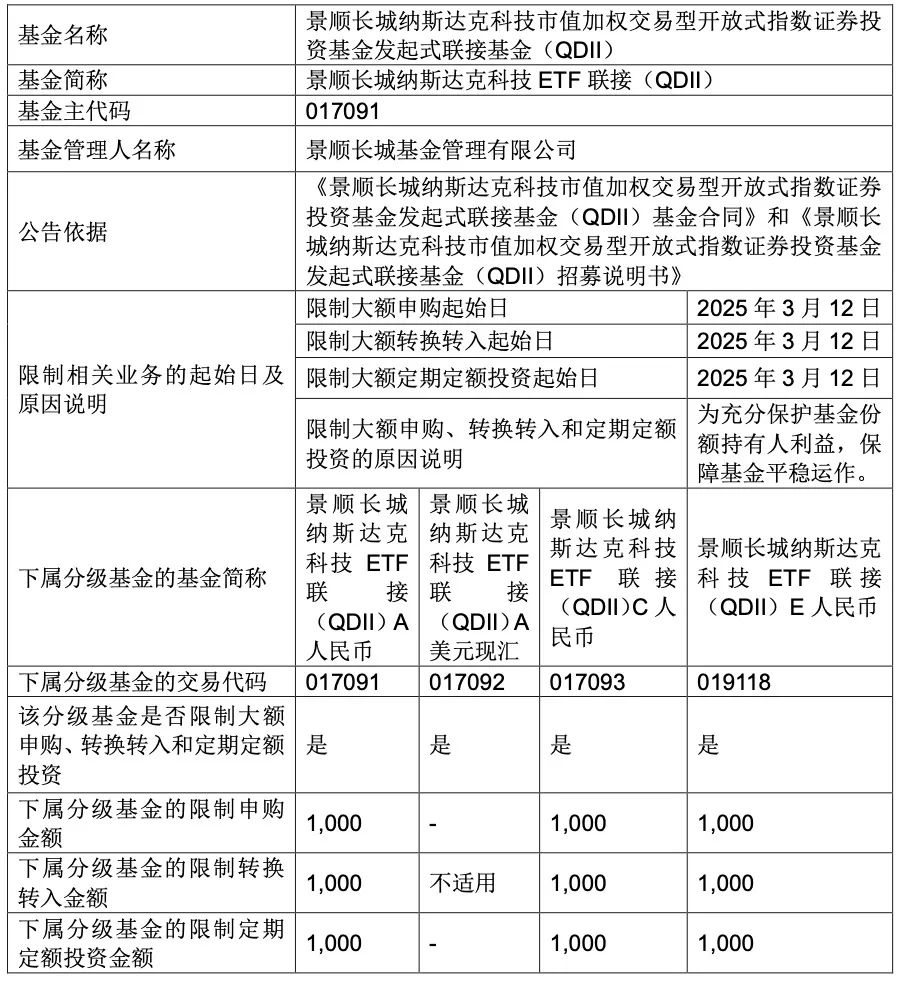 3月12日,景顺长城基金发布公告,自3月12日起,景顺长城纳斯达克科技市值加权ETF联接基金相关人民币基金份额大额申购限制额度由此前的100元调整为1000元,美元份额维持暂停申购状态。